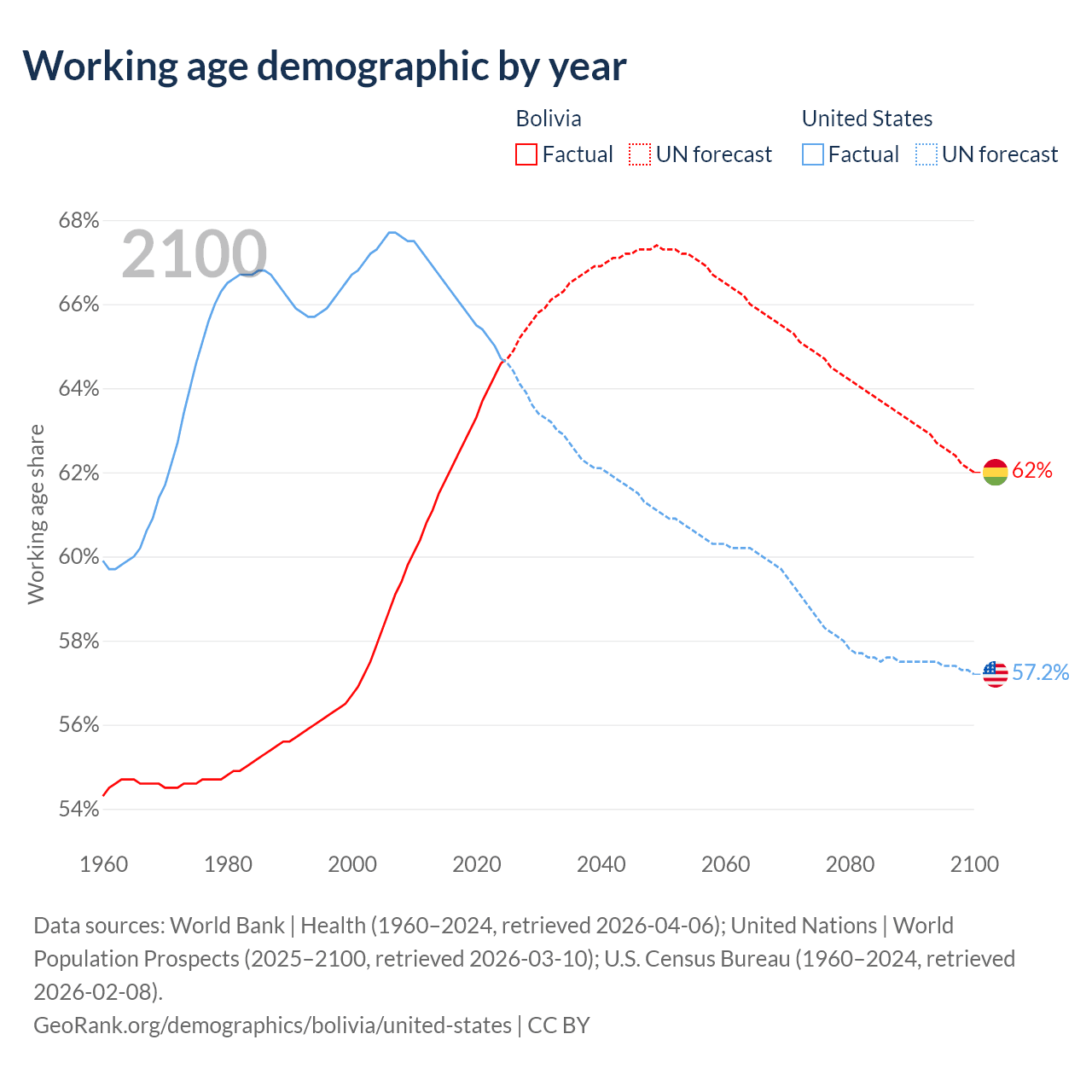 Median age Bolivia vs United States, 1960-2100