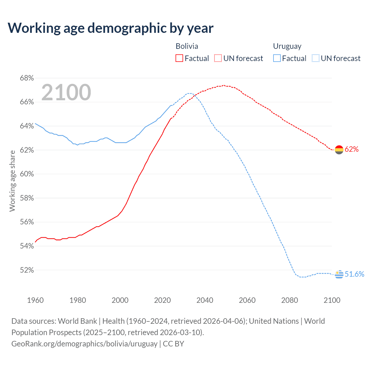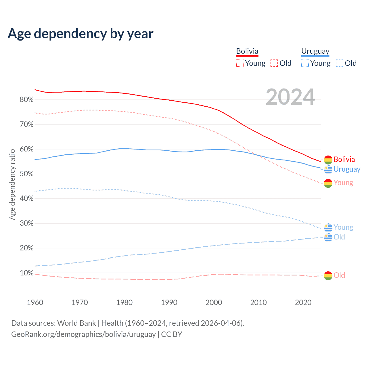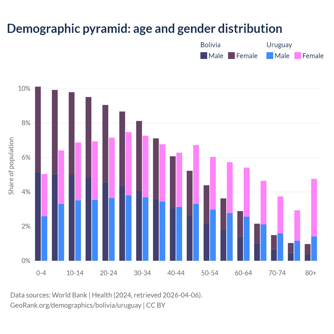 The share of older people aged 65 and over is 5.64% in Bolivia and 16% in Uruguay. Life expectancy in Bolivia compared to Uruguay .