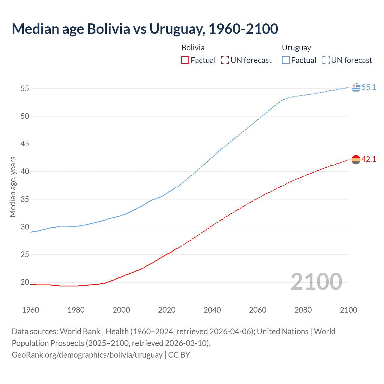 Median age Bolivia vs Uruguay, 1960-2100