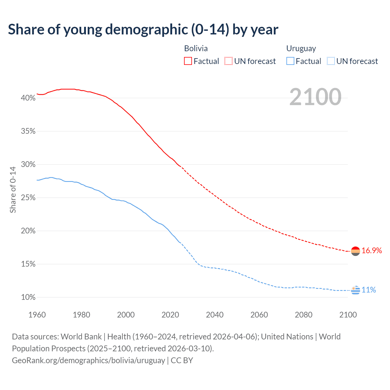 - The share of young demographic (0-15 years old) in Bolivia is 29.8% vs 18.3% in Uruguay.