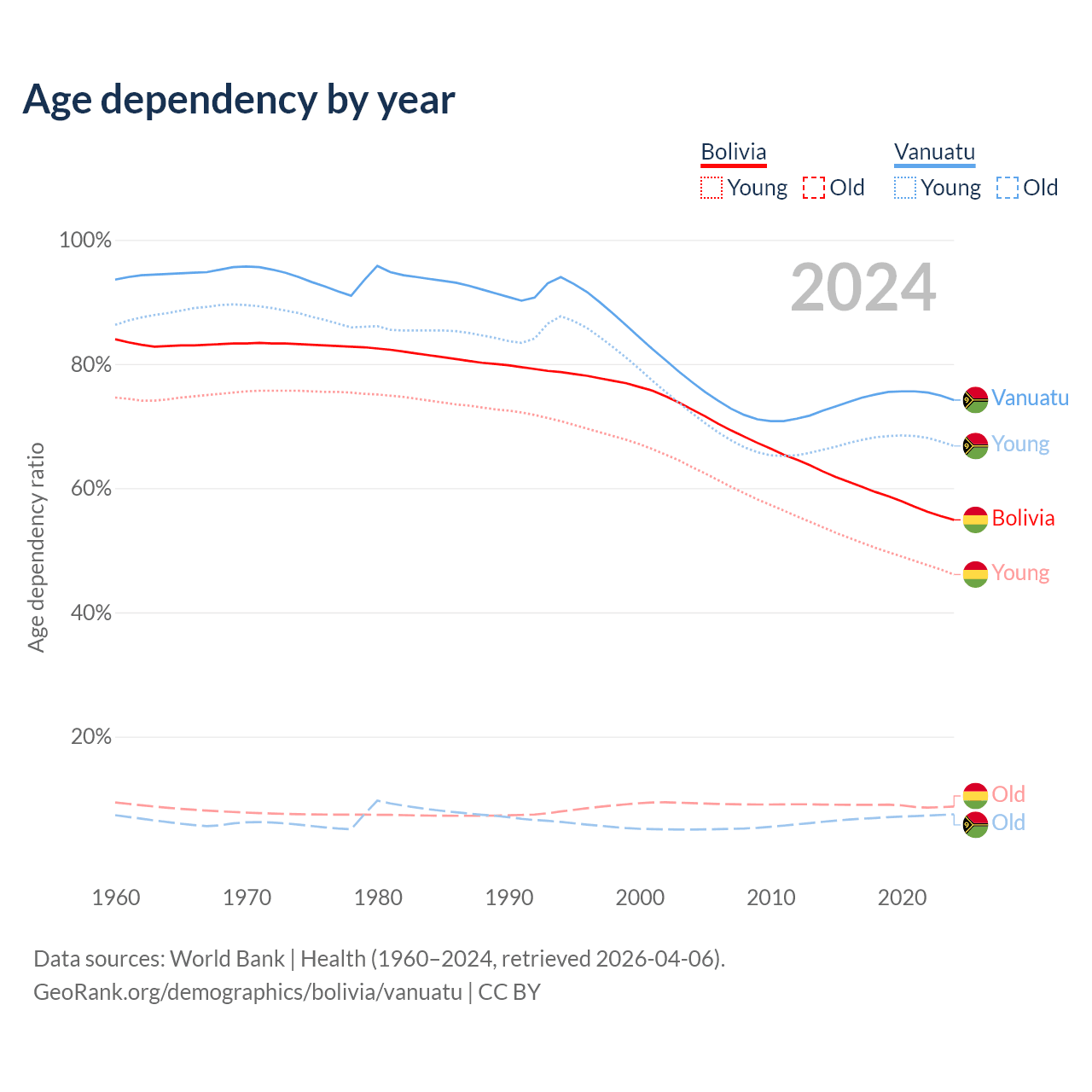 - Bolivia is ranked 128/196 by median age (oldest to youngest) vs 156/196 for Vanuatu.