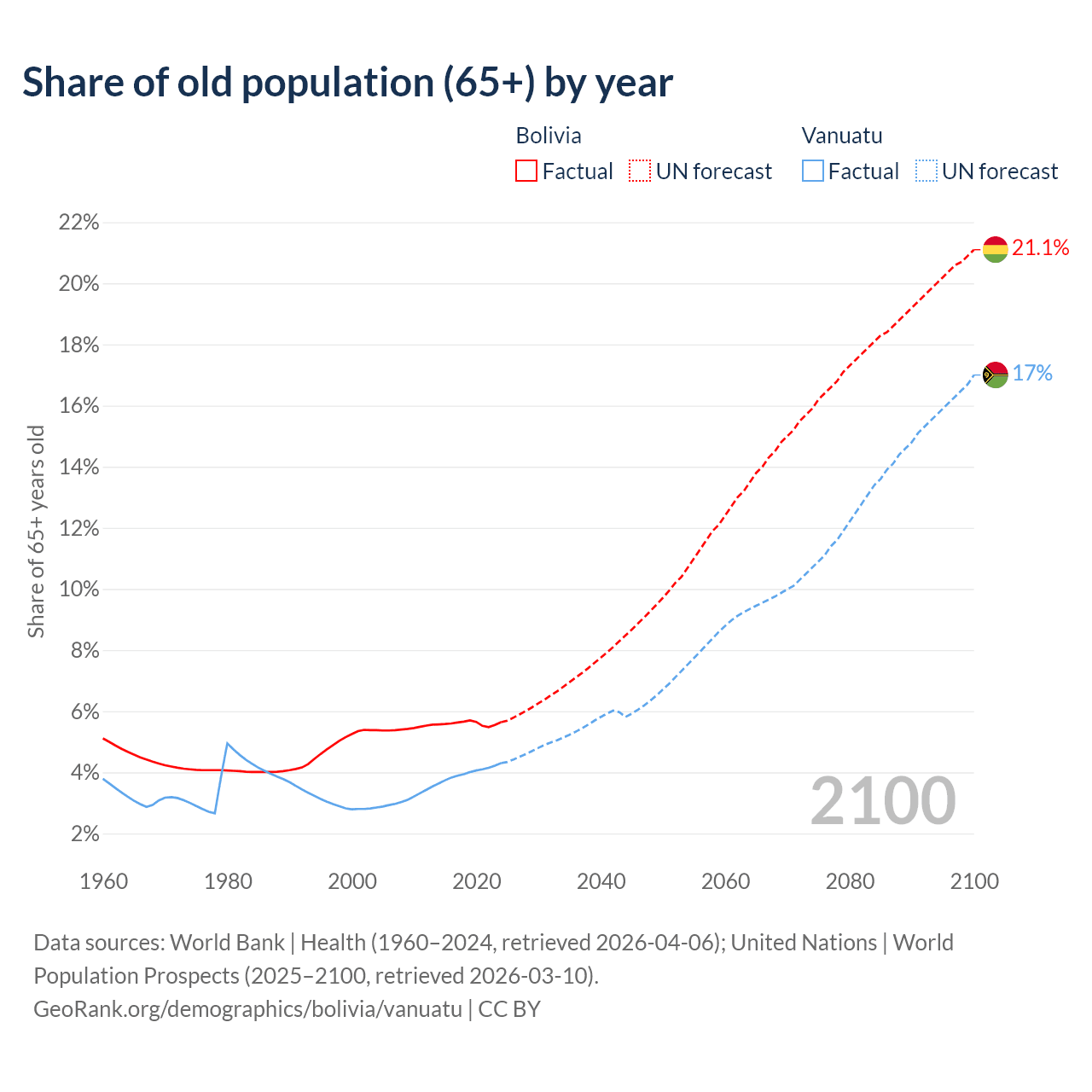 The share of older people aged 65 and over is 5.64% in Bolivia and 4.3% in Vanuatu. Life expectancy in Bolivia compared to Vanuatu .