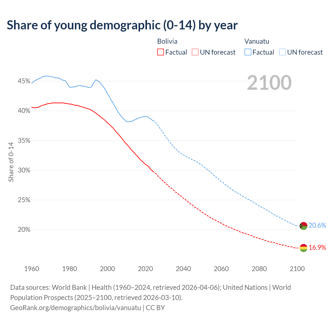 - The share of young demographic (0-15 years old) in Bolivia is 29.8% vs 38.3% in Vanuatu.