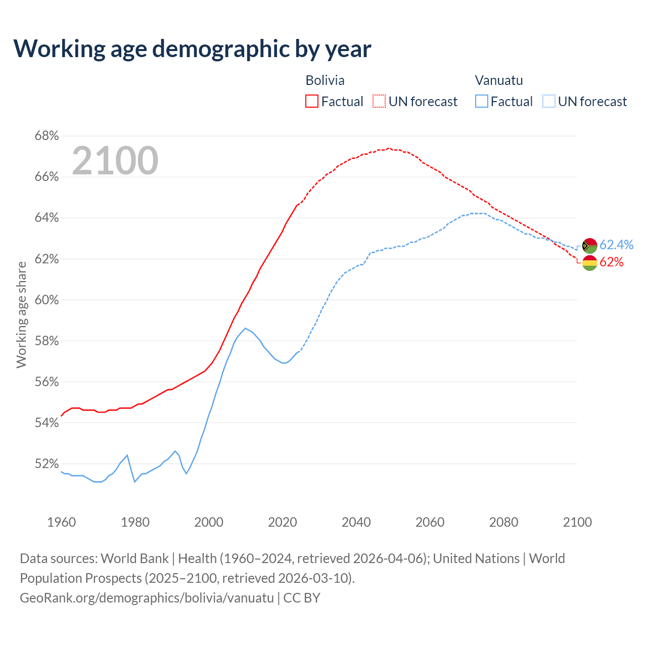 - Bolivia has 8.26M working age adults (aged 15-64) vs 198K in Vanuatu.