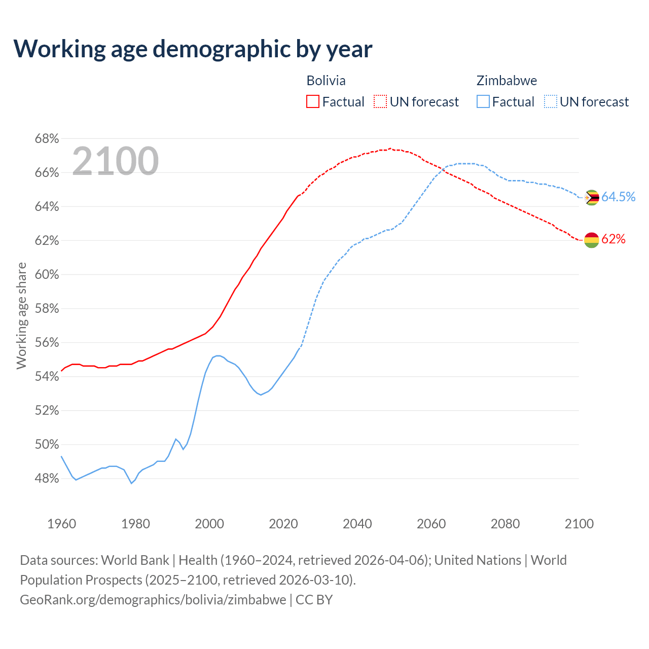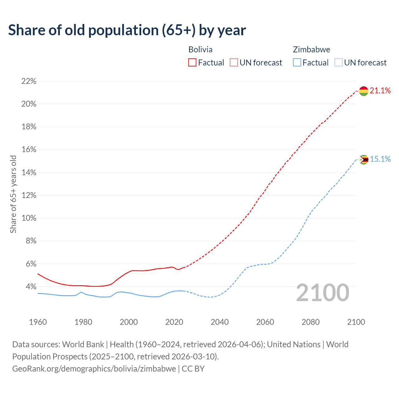 The share of older people aged 65 and over is 5.64% in Bolivia and 3.6% in Zimbabwe. Life expectancy in Bolivia compared to Zimbabwe .