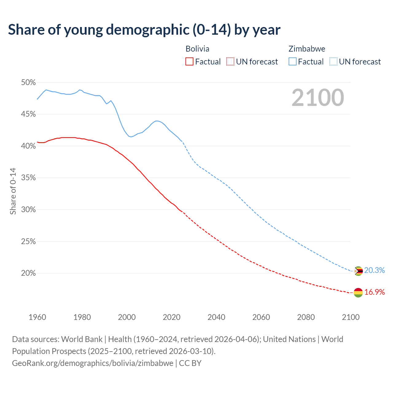 - The share of young demographic (0-15 years old) in Bolivia is 29.8% vs 40.9% in Zimbabwe.