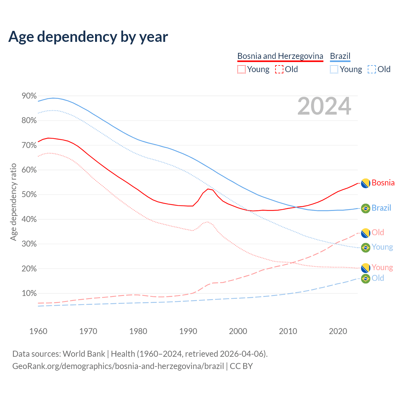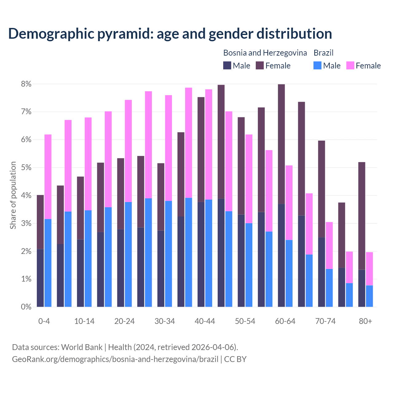 - Bosnia and Herzegovina is ranked 8/196 by median age (oldest to youngest) vs 73/196 for Brazil.