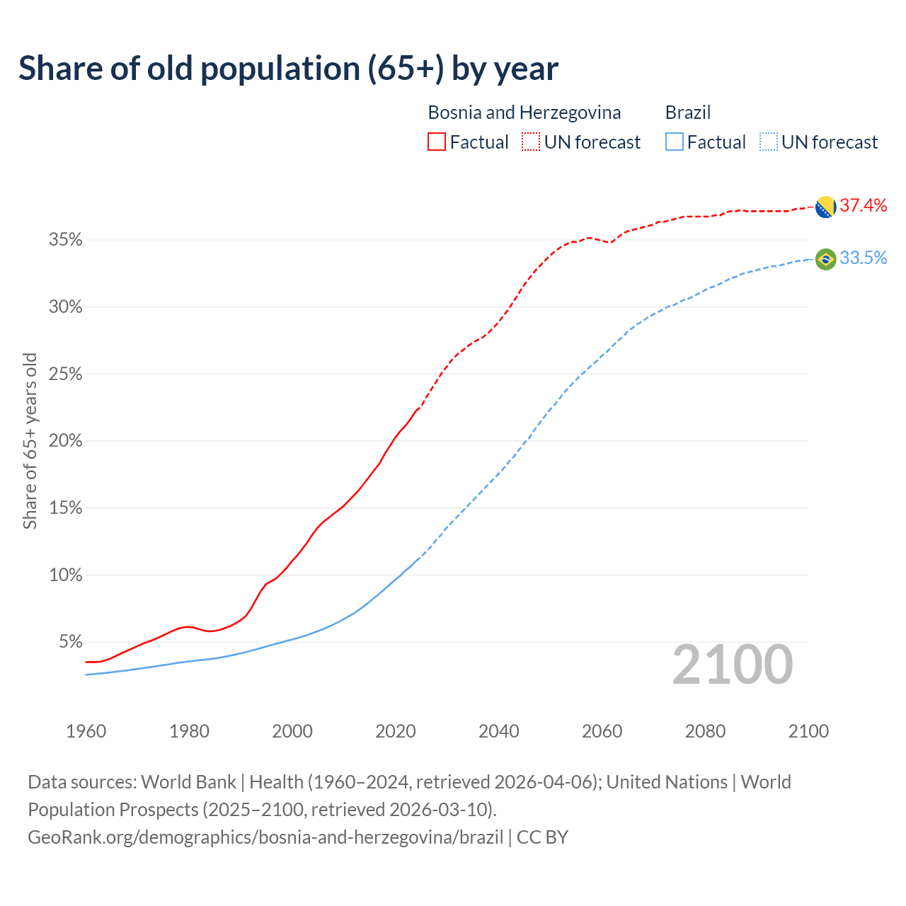 The share of older people aged 65 and over is 22.2% in Bosnia and Herzegovina and 11% in Brazil. Life expectancy in Bosnia and Herzegovina compared to Brazil .