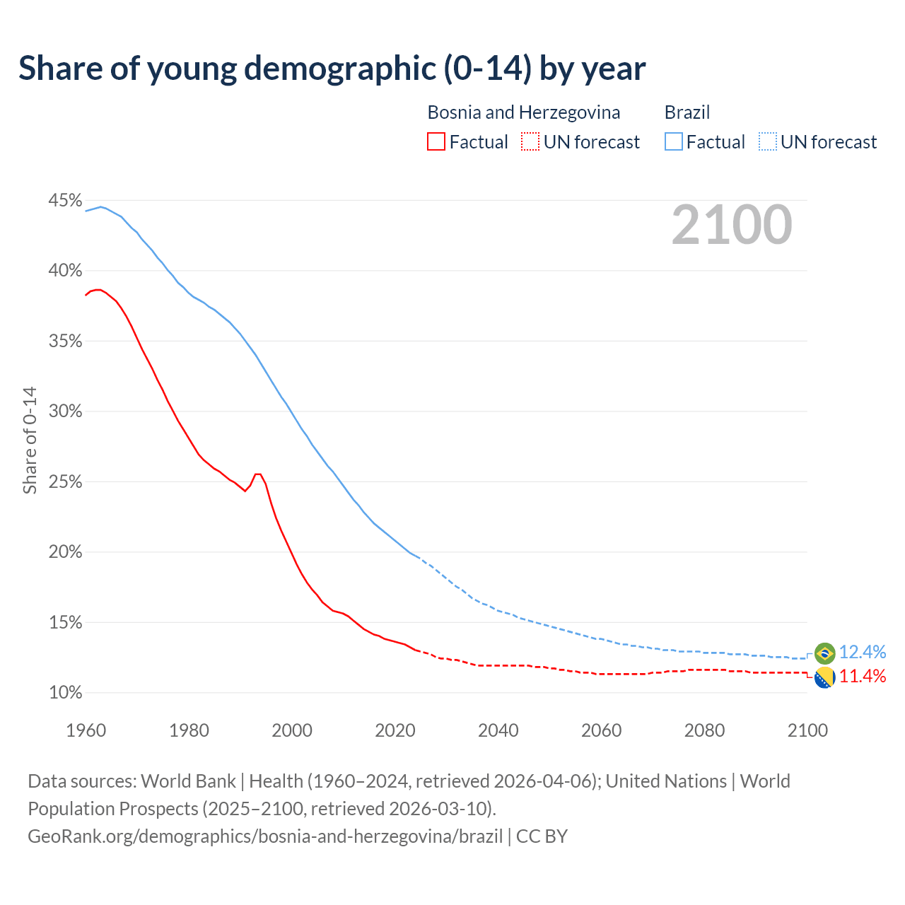 - The share of young demographic (0-15 years old) in Bosnia and Herzegovina is 13% vs 19.7% in Brazil.