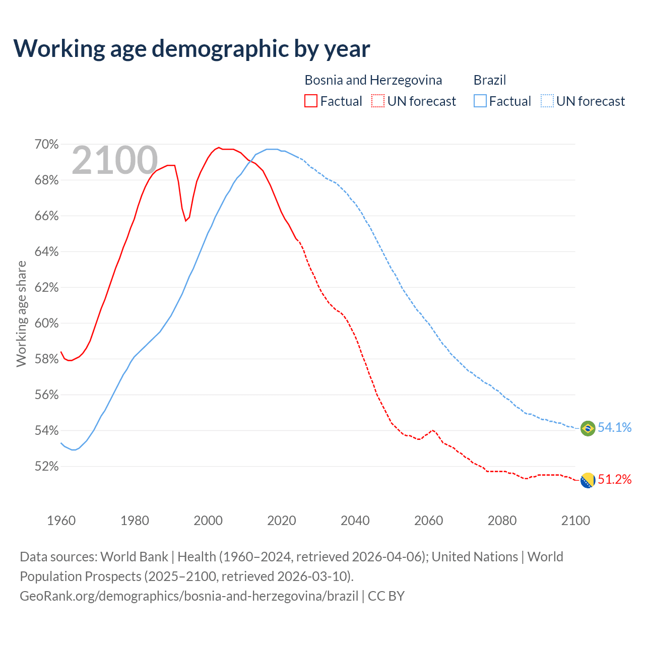 - Bosnia and Herzegovina has 2.02M working age adults (aged 15-64) vs 148M in Brazil.