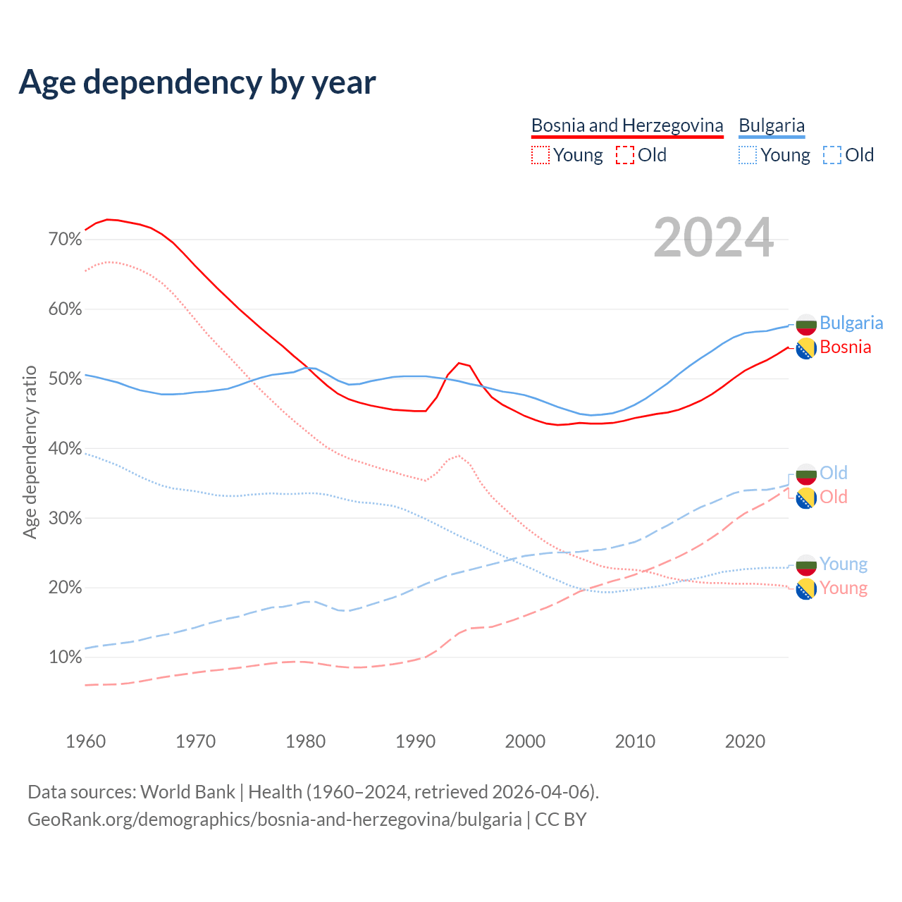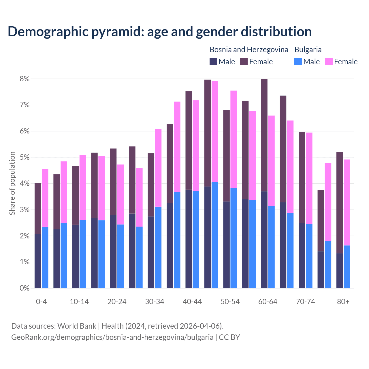 The share of older people aged 65 and over is 22.2% in Bosnia and Herzegovina and 22% in Bulgaria. Life expectancy in Bosnia and Herzegovina compared to Bulgaria .