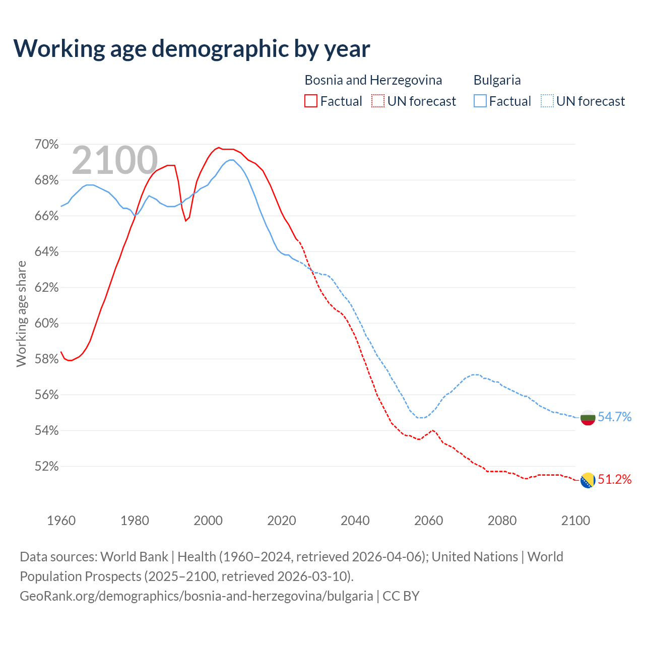 Median age Bosnia and Herzegovina vs Bulgaria, 1960-2100