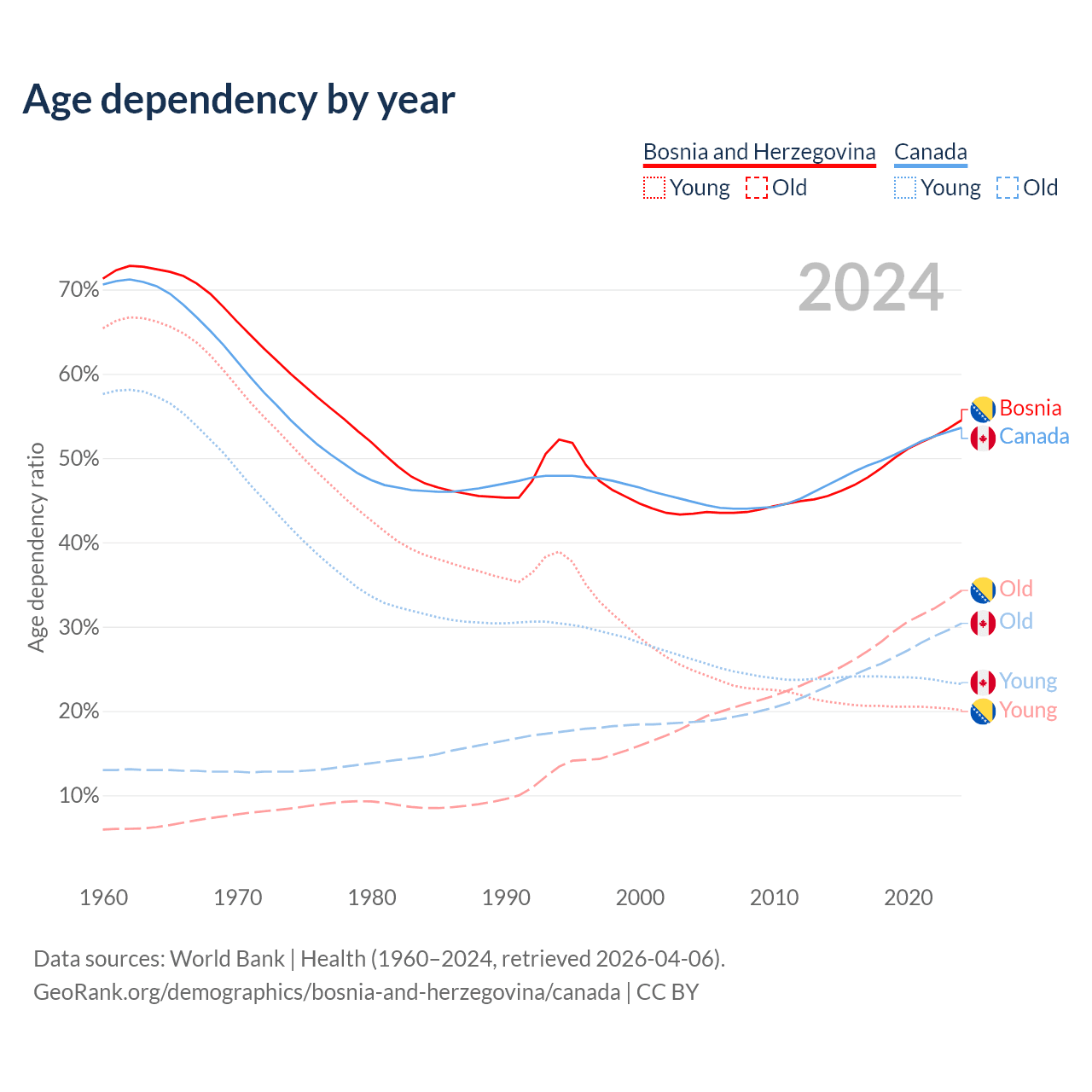 - The share of old-age demographic (65+) in Bosnia and Herzegovina is 22.2% vs 19.8% in Canada.