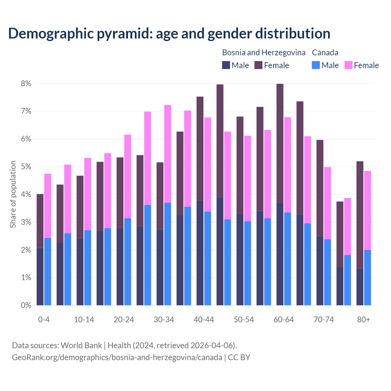 - Bosnia and Herzegovina is ranked 8/196 by median age (oldest to youngest) vs 38/196 for Canada.