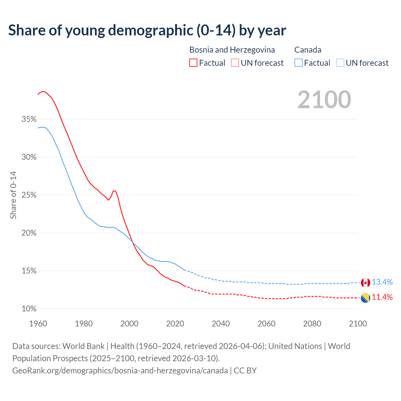 - The share of young demographic (0-15 years old) in Bosnia and Herzegovina is 13% vs 15.1% in Canada.