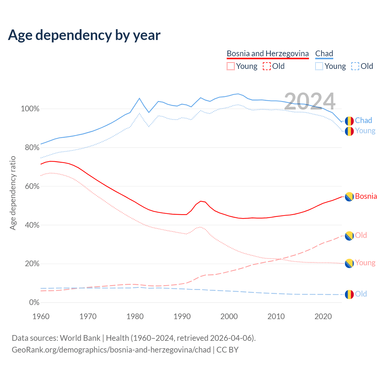 - Bosnia and Herzegovina is ranked 8/196 by median age (oldest to youngest) vs 192/196 for Chad.