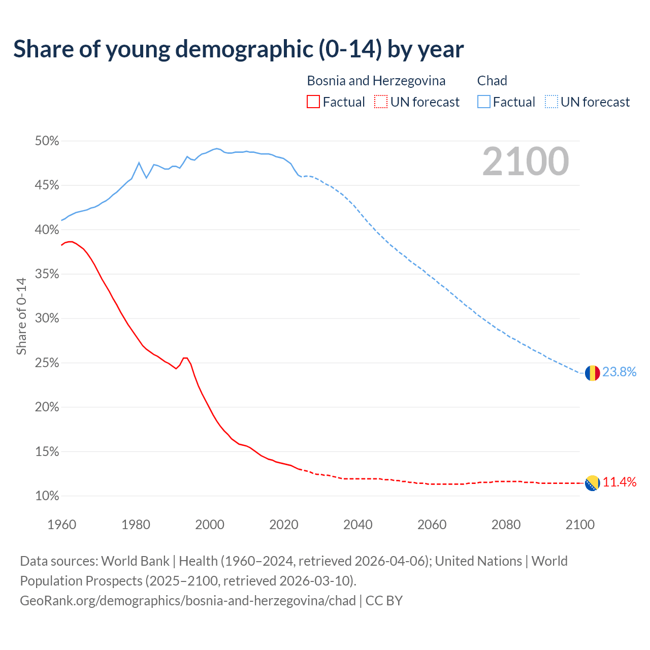 - The share of young demographic (0-15 years old) in Bosnia and Herzegovina is 13% vs 46.1% in Chad.