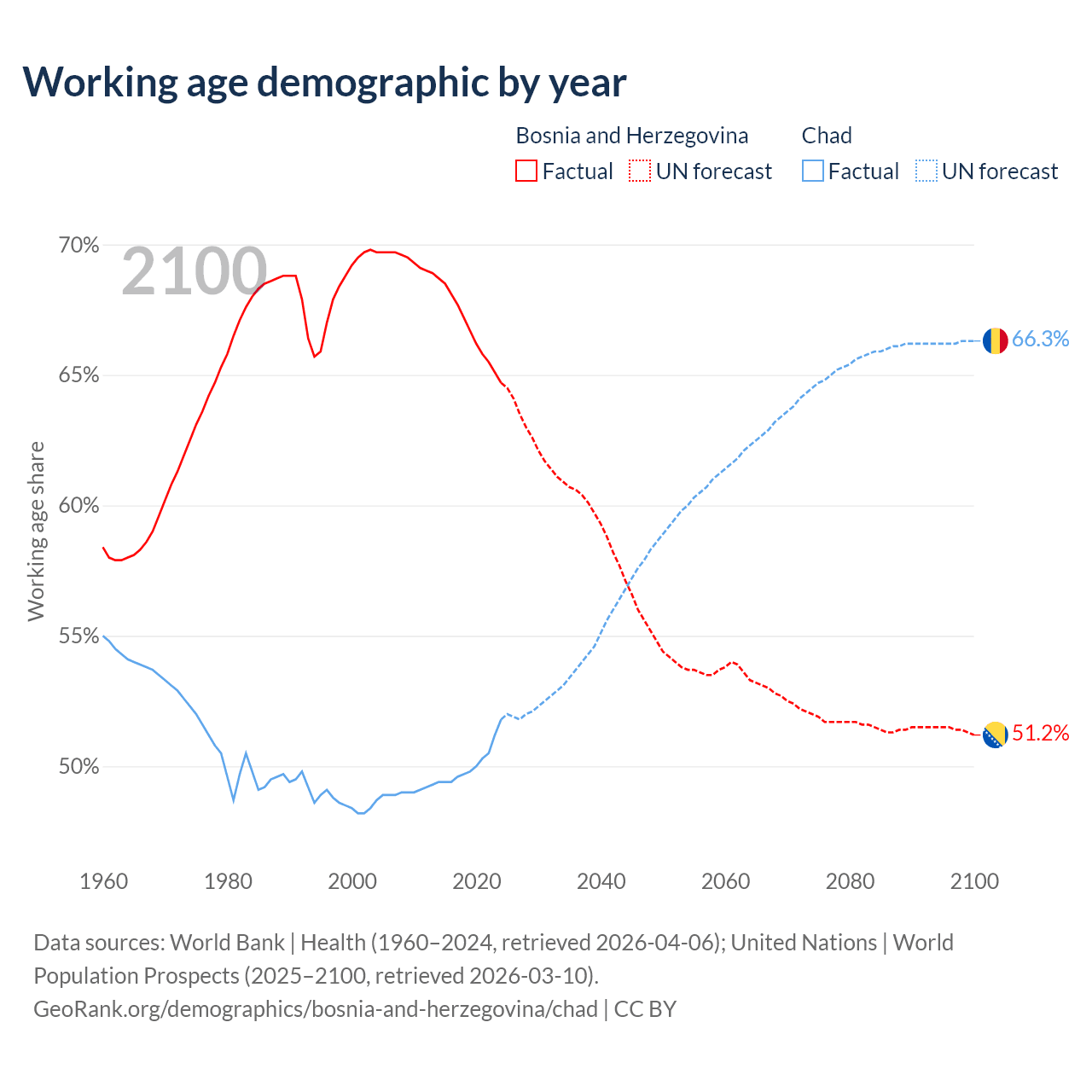 - Bosnia and Herzegovina has 2.02M working age adults (aged 15-64) vs 11.3M in Chad.