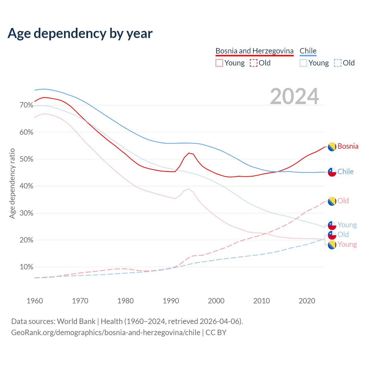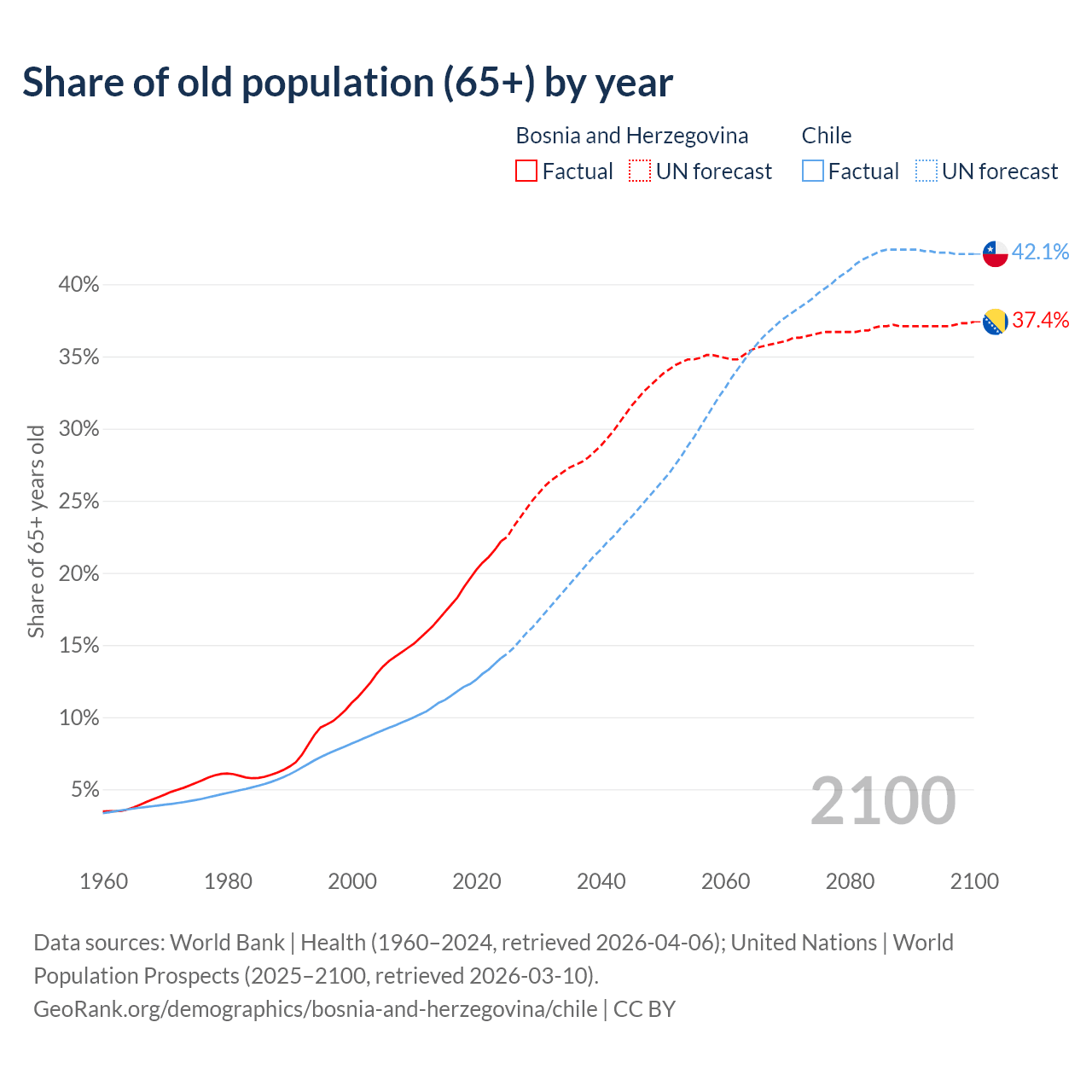 - The share of old-age demographic (65+) in Bosnia and Herzegovina is 22.2% vs 14.1% in Chile.
