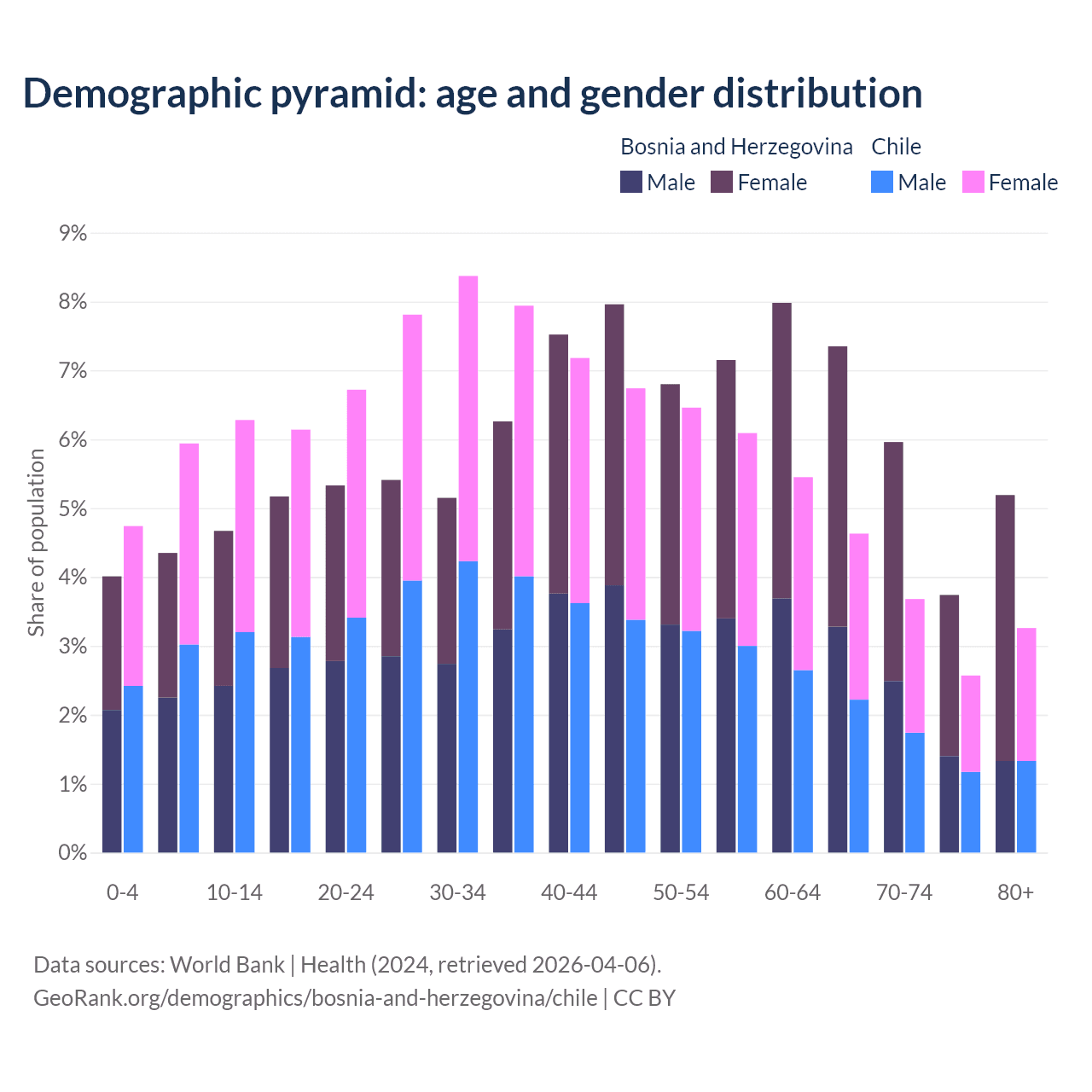 - Bosnia and Herzegovina is ranked 8/196 by median age (oldest to youngest) vs 61/196 for Chile.