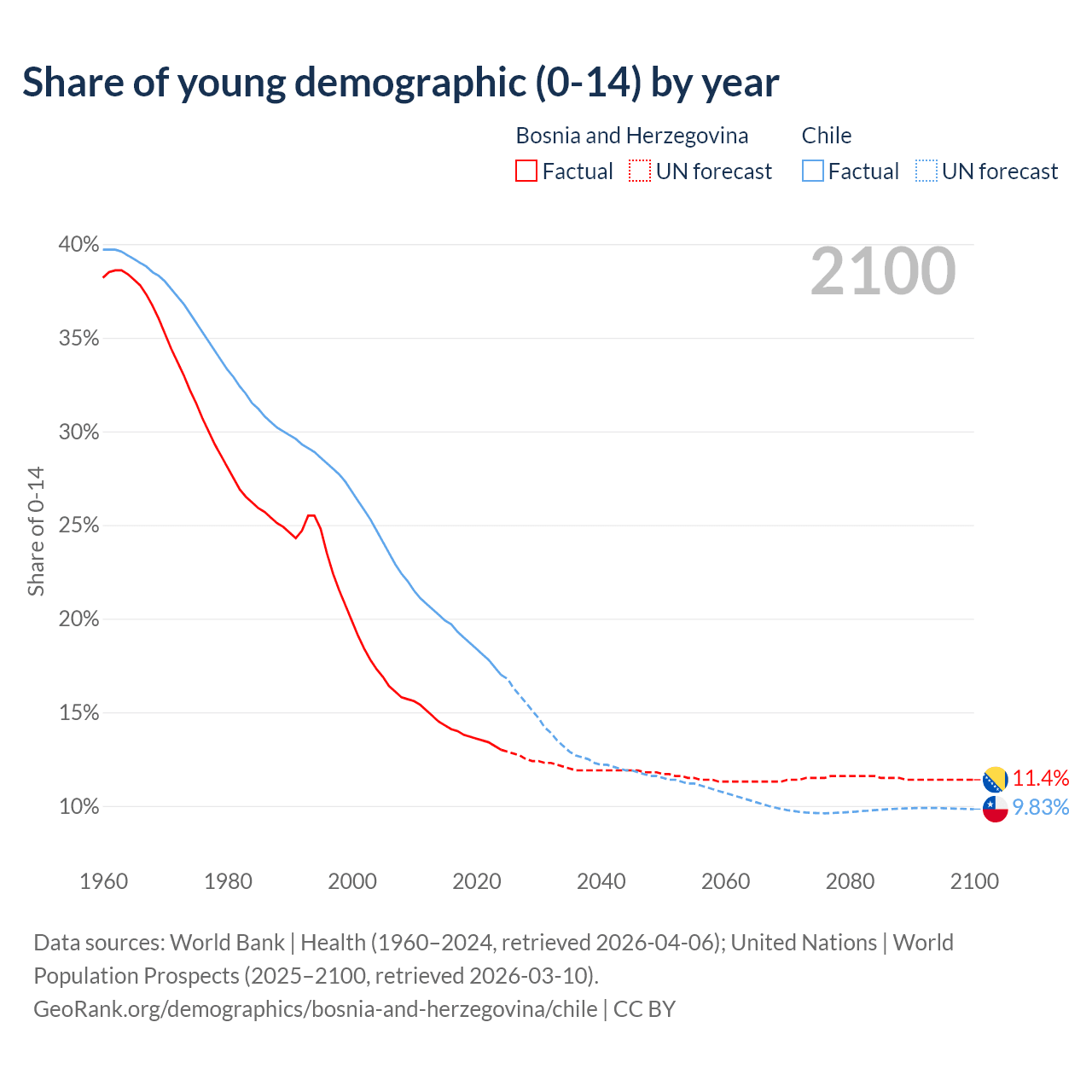 - The share of young demographic (0-15 years old) in Bosnia and Herzegovina is 13% vs 17% in Chile.