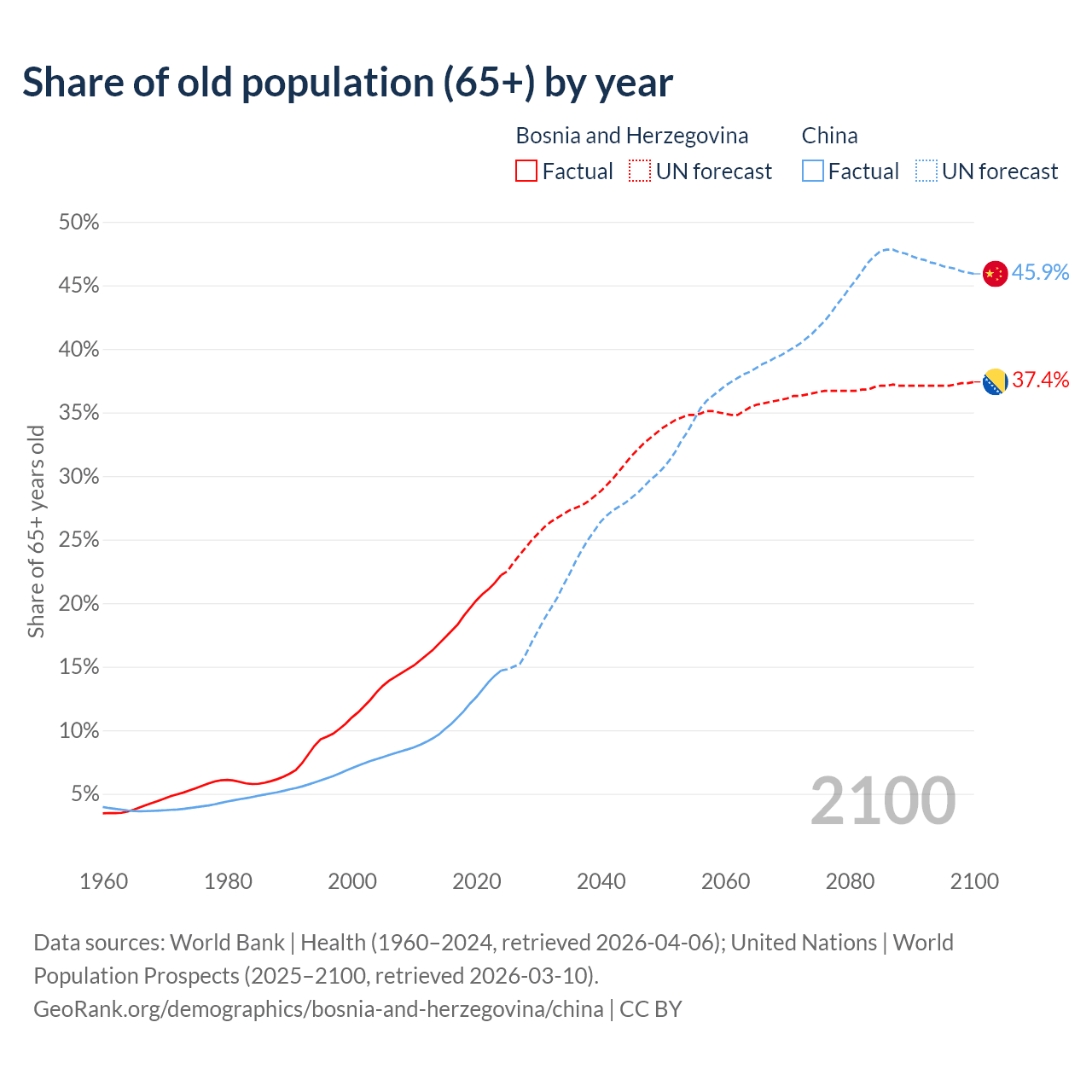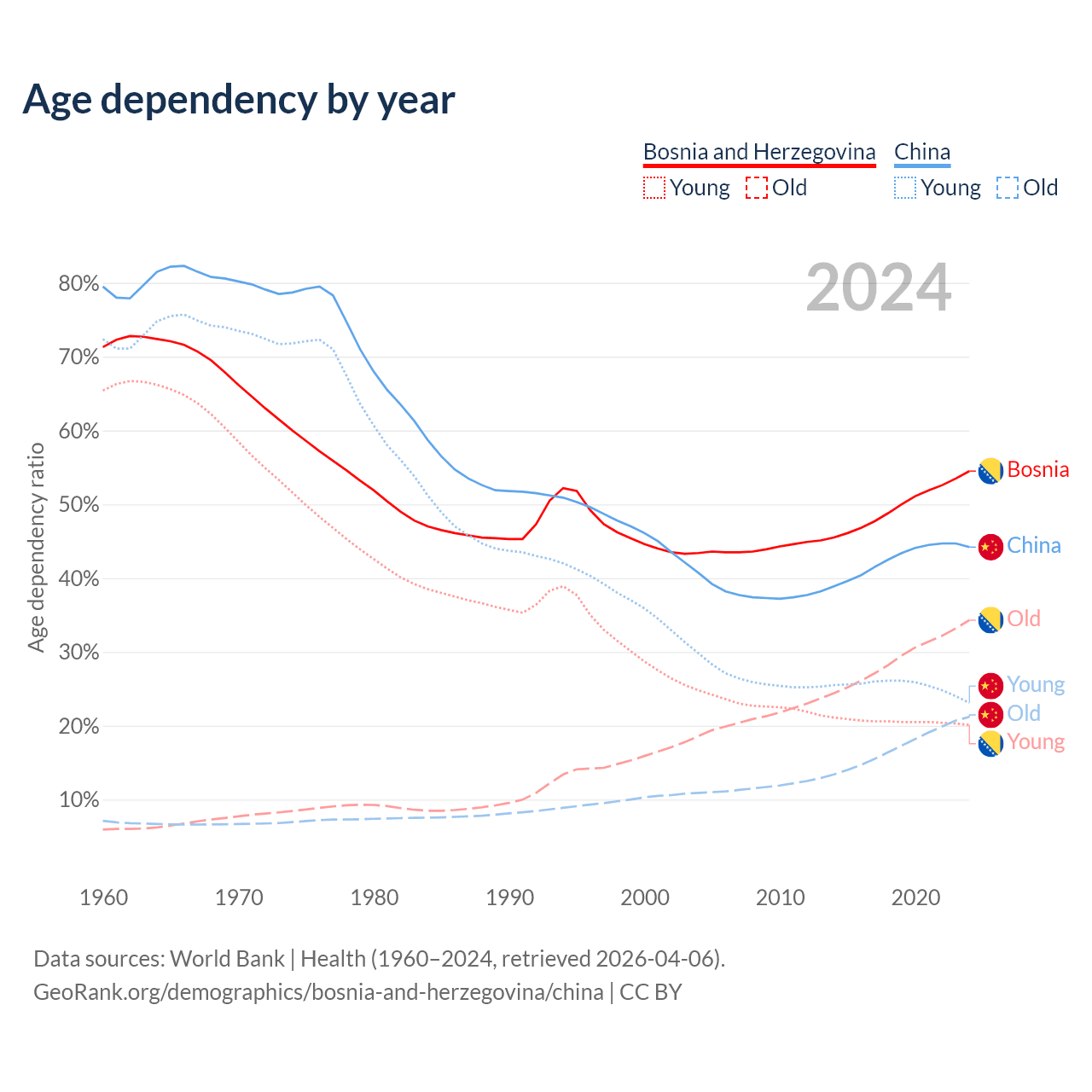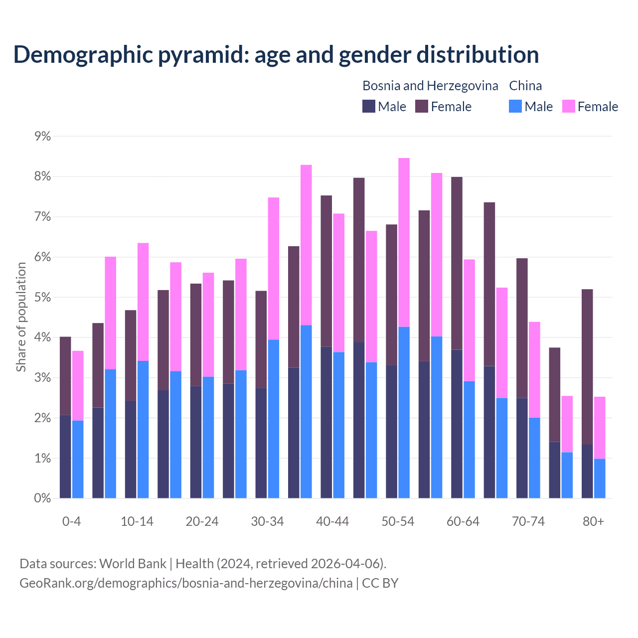 - Bosnia and Herzegovina is ranked 8/196 by median age (oldest to youngest) vs 44/196 for China.