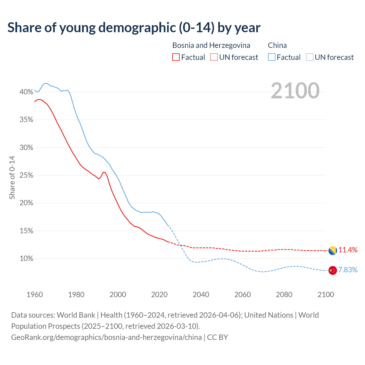 - The share of young demographic (0-15 years old) in Bosnia and Herzegovina is 13% vs 16% in China.
