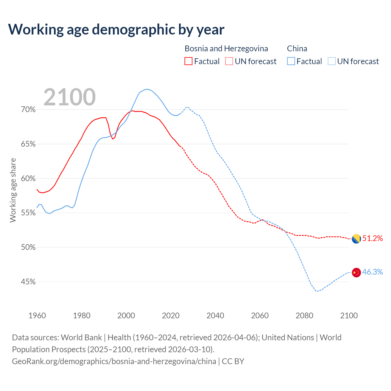 - Bosnia and Herzegovina has 2.02M working age adults (aged 15-64) vs 972M in China.