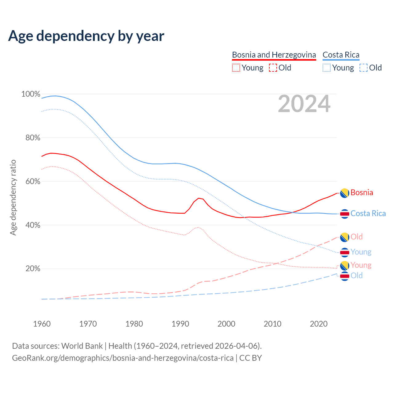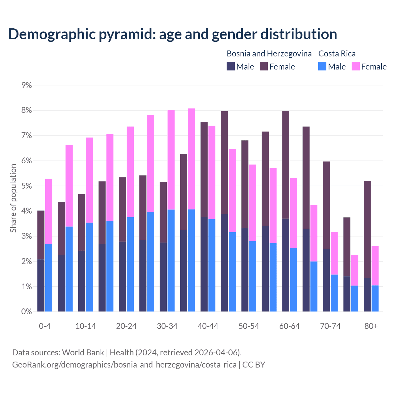 - The share of old-age demographic (65+) in Bosnia and Herzegovina is 22.2% vs 12.2% in Costa Rica.