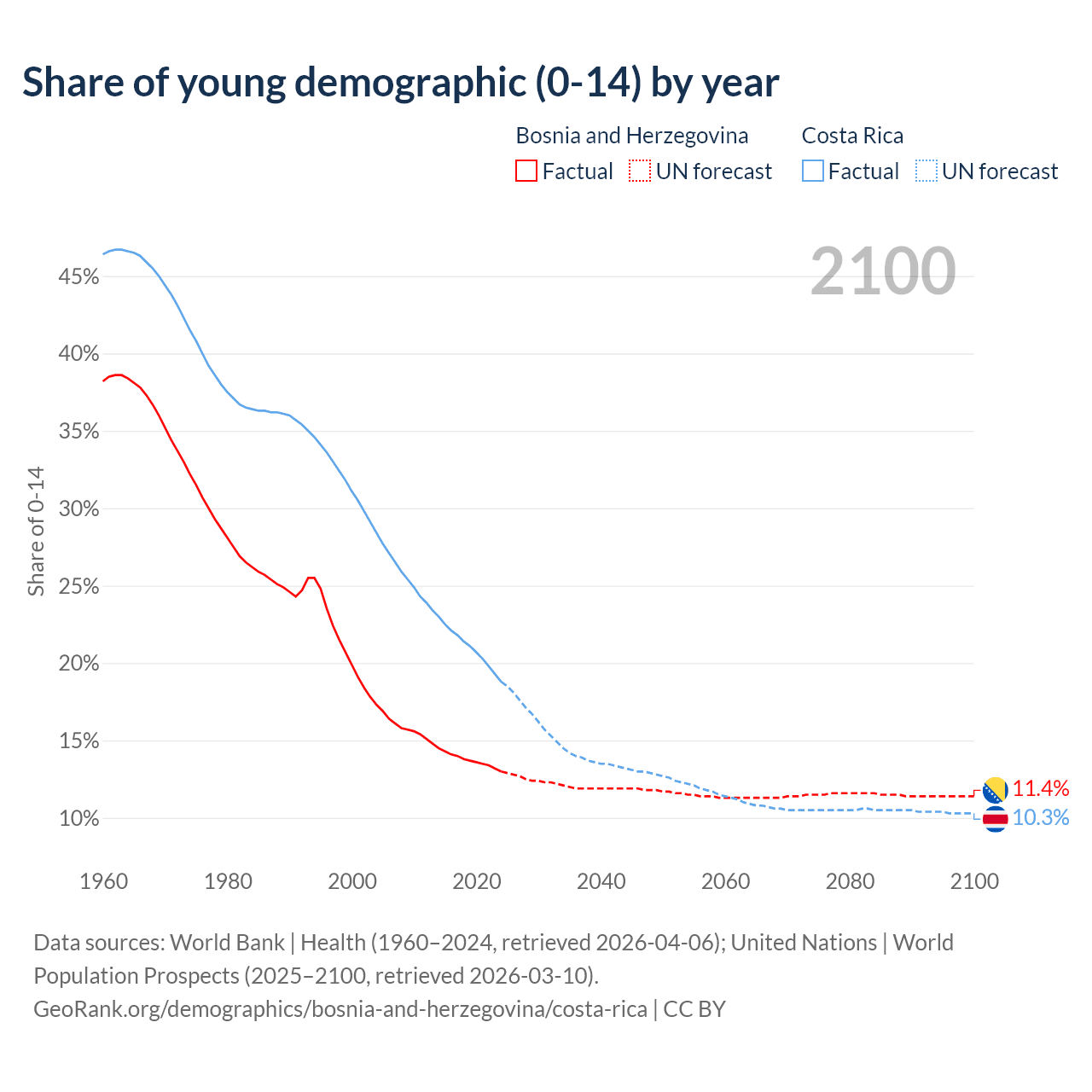 - The share of young demographic (0-15 years old) in Bosnia and Herzegovina is 13% vs 18.8% in Costa Rica.