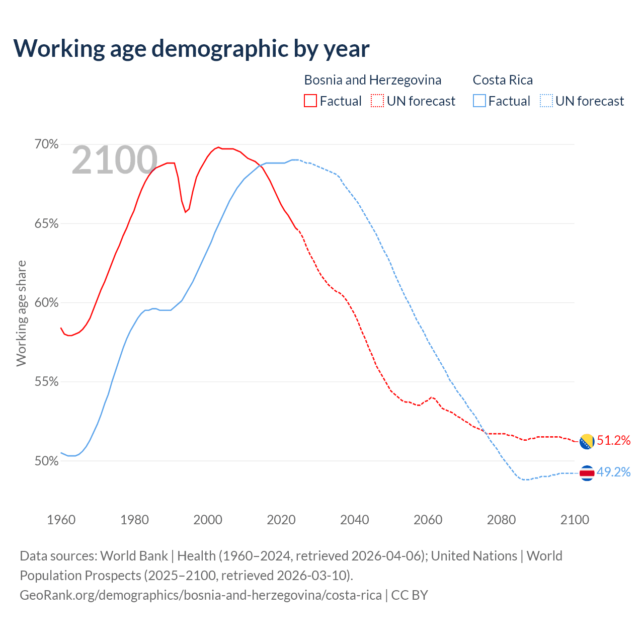 Median age Bosnia and Herzegovina vs Costa Rica, 1960-2100