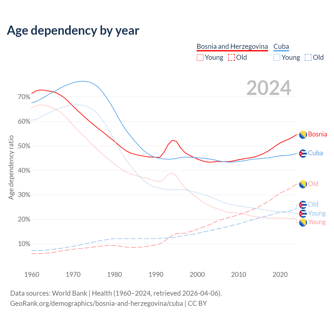 - Bosnia and Herzegovina is ranked 8/196 by median age (oldest to youngest) vs 27/196 for Cuba.