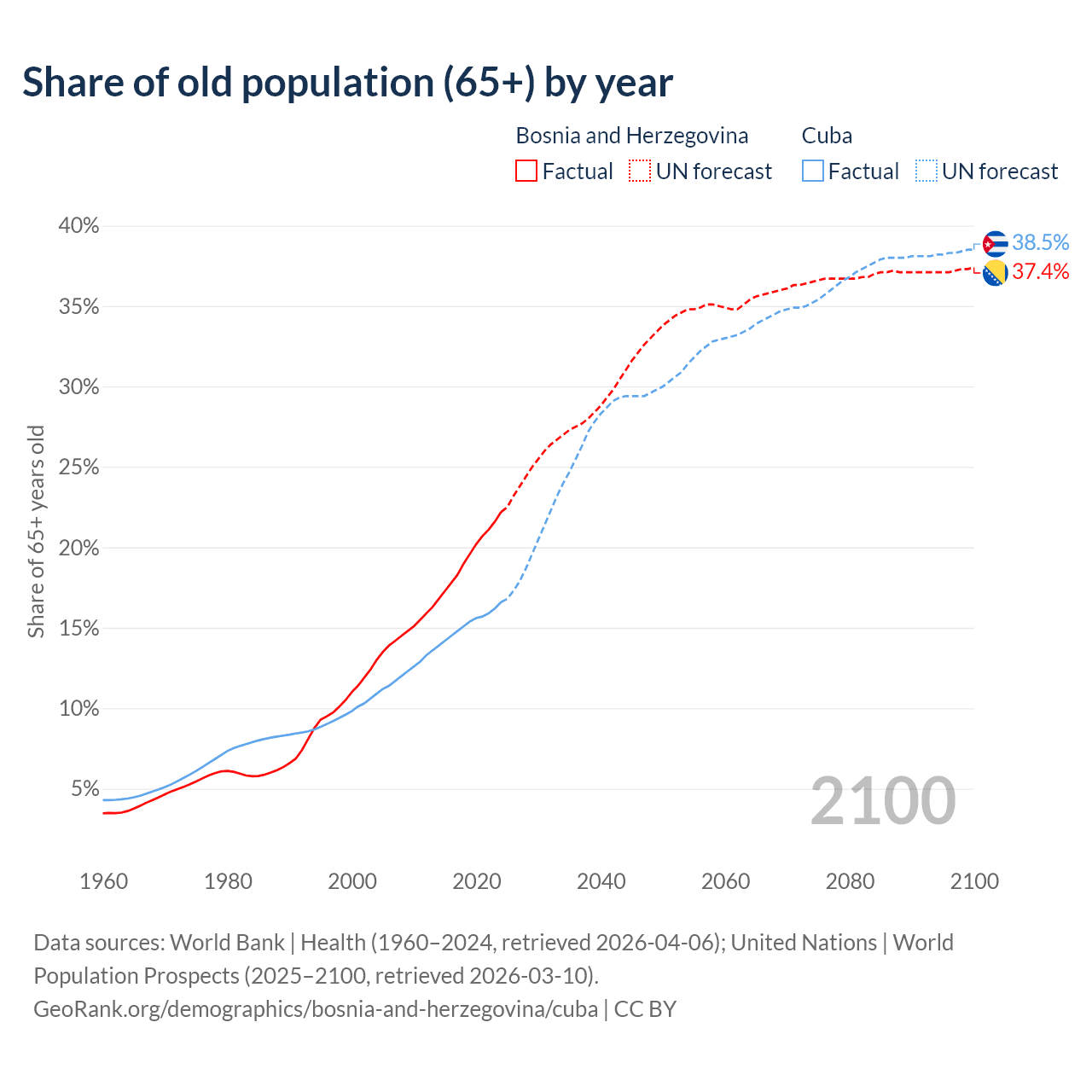 - The share of old-age demographic (65+) in Bosnia and Herzegovina is 22.2% vs 16.6% in Cuba.