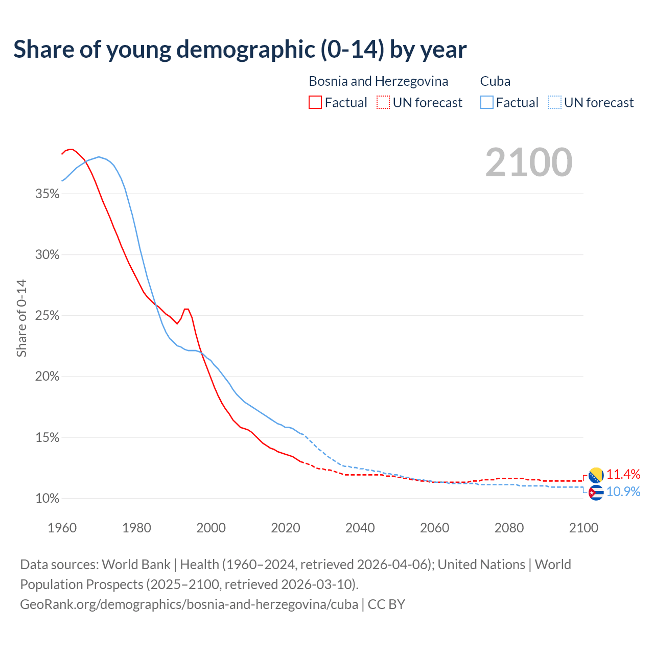 - The share of young demographic (0-15 years old) in Bosnia and Herzegovina is 13% vs 15.3% in Cuba.