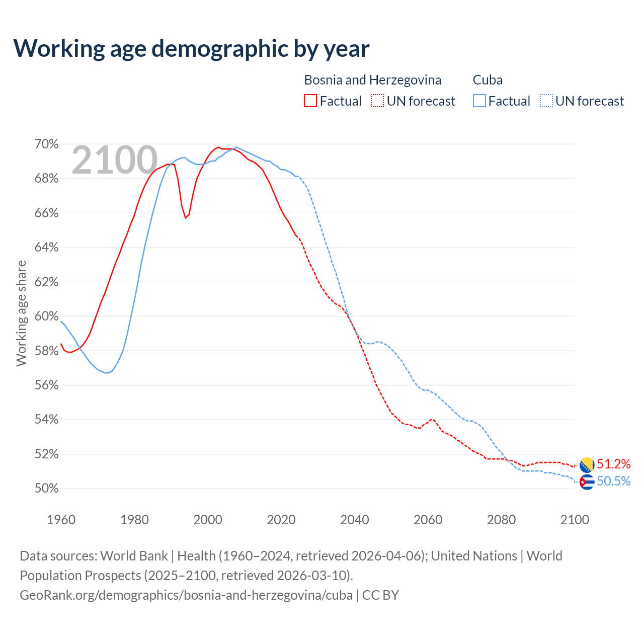 - Bosnia and Herzegovina has 2.02M working age adults (aged 15-64) vs 7.42M in Cuba.