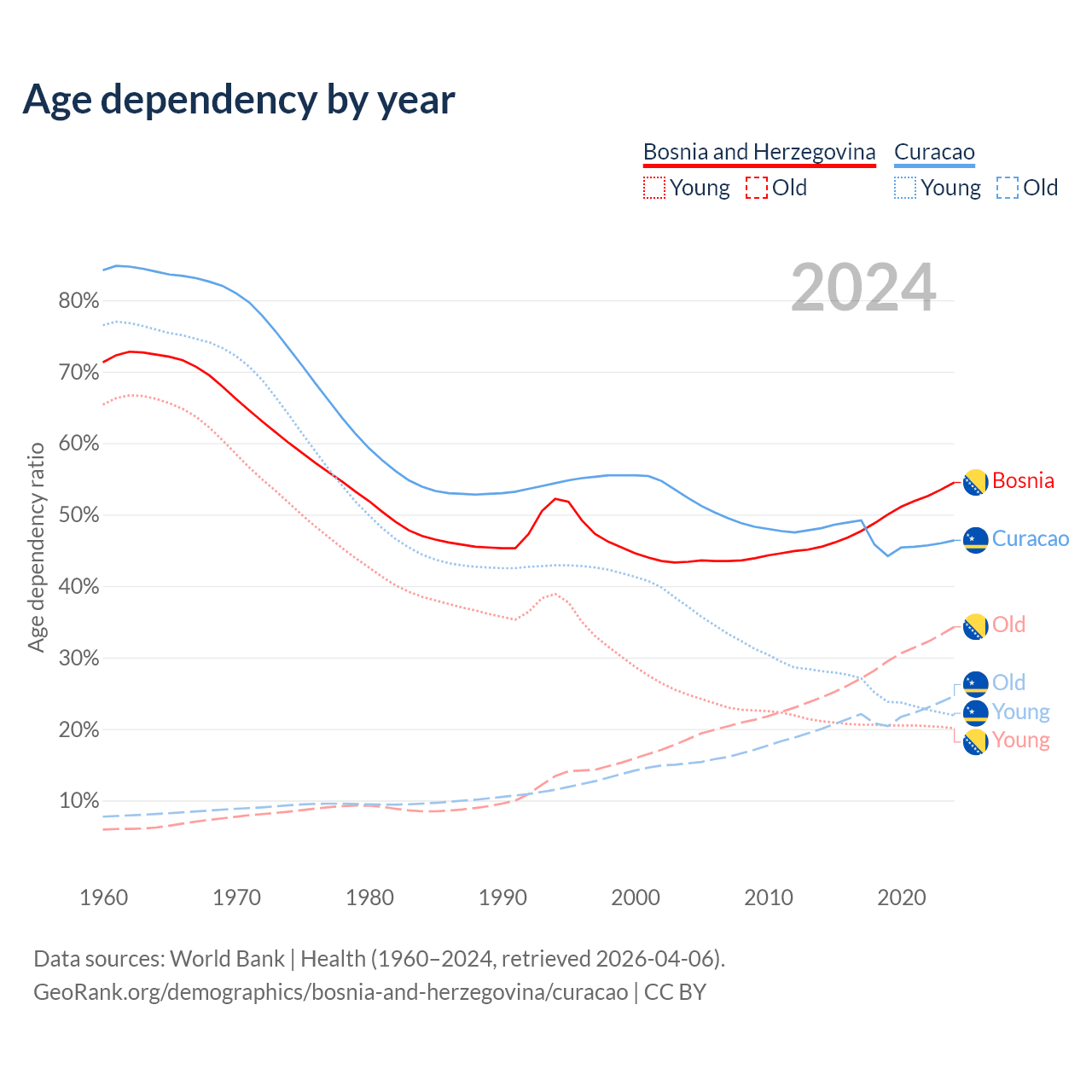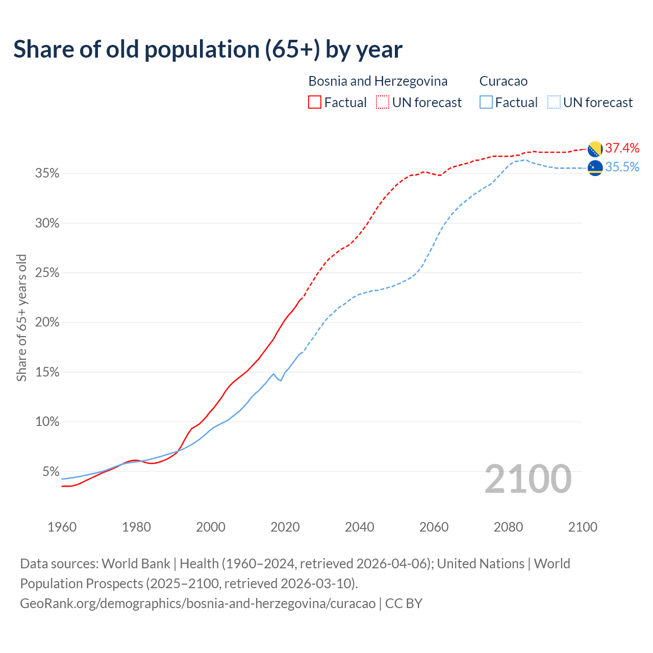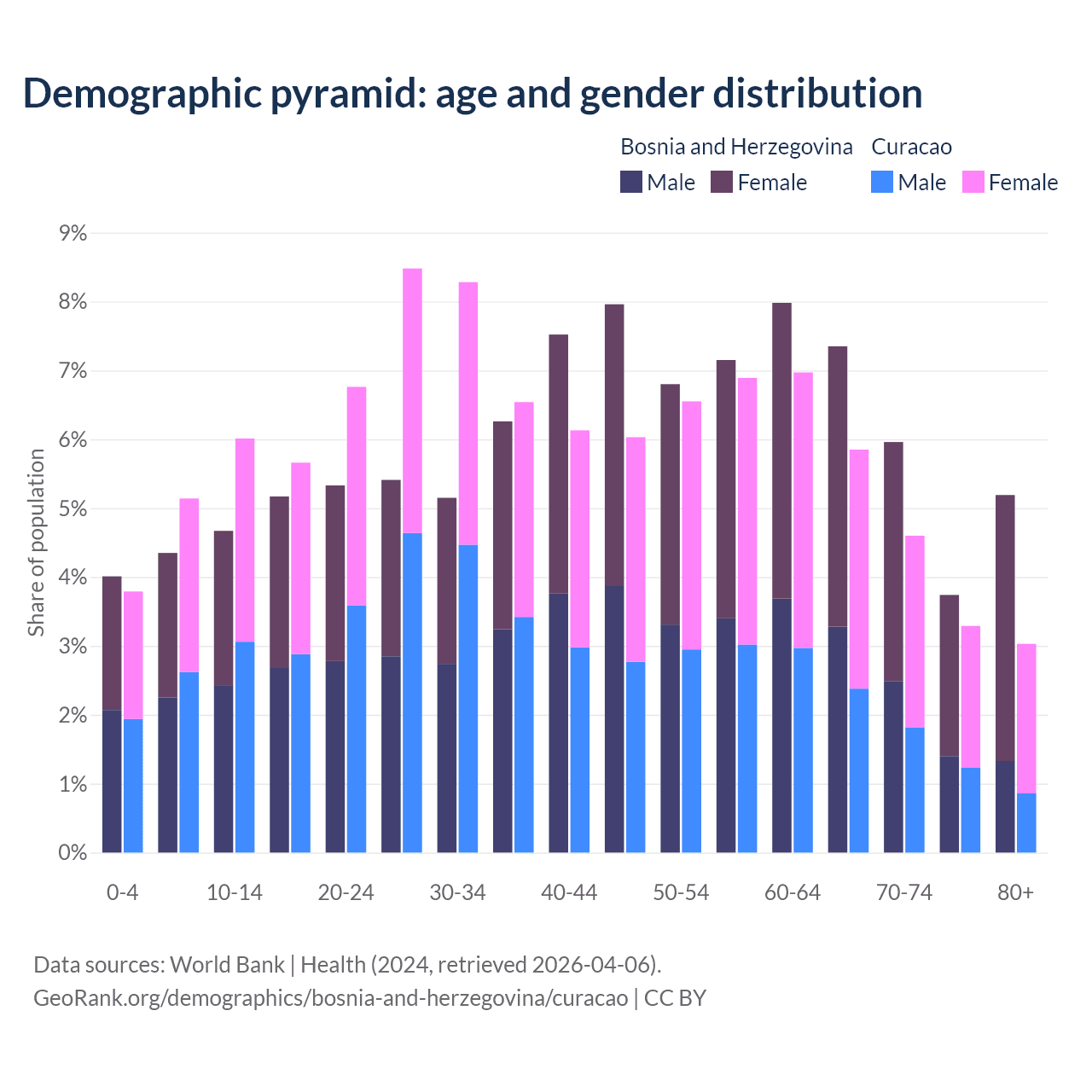 - The share of old-age demographic (65+) in Bosnia and Herzegovina is 22.2% vs 16.8% in Curacao.