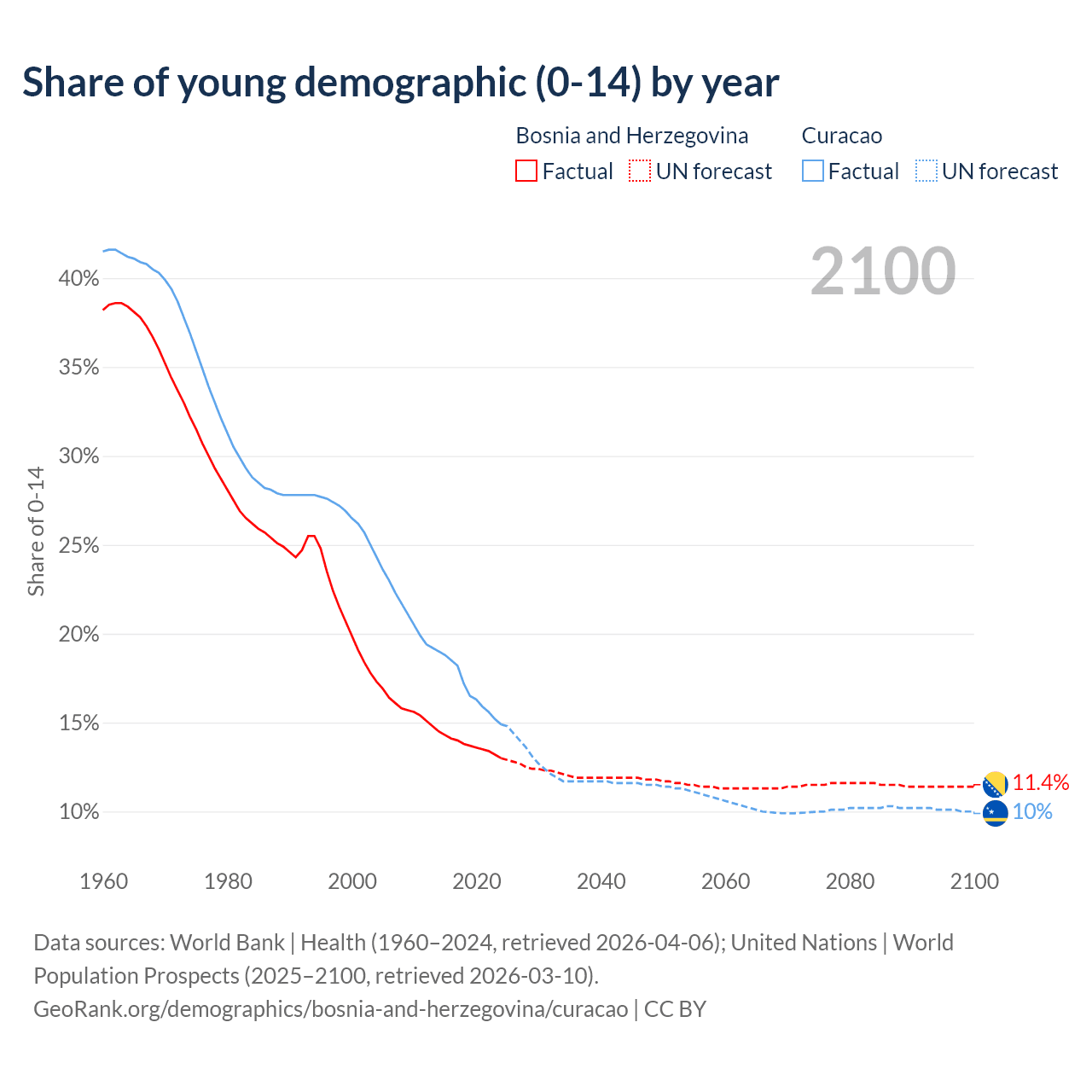 - The share of young demographic (0-15 years old) in Bosnia and Herzegovina is 13% vs 14.9% in Curacao.