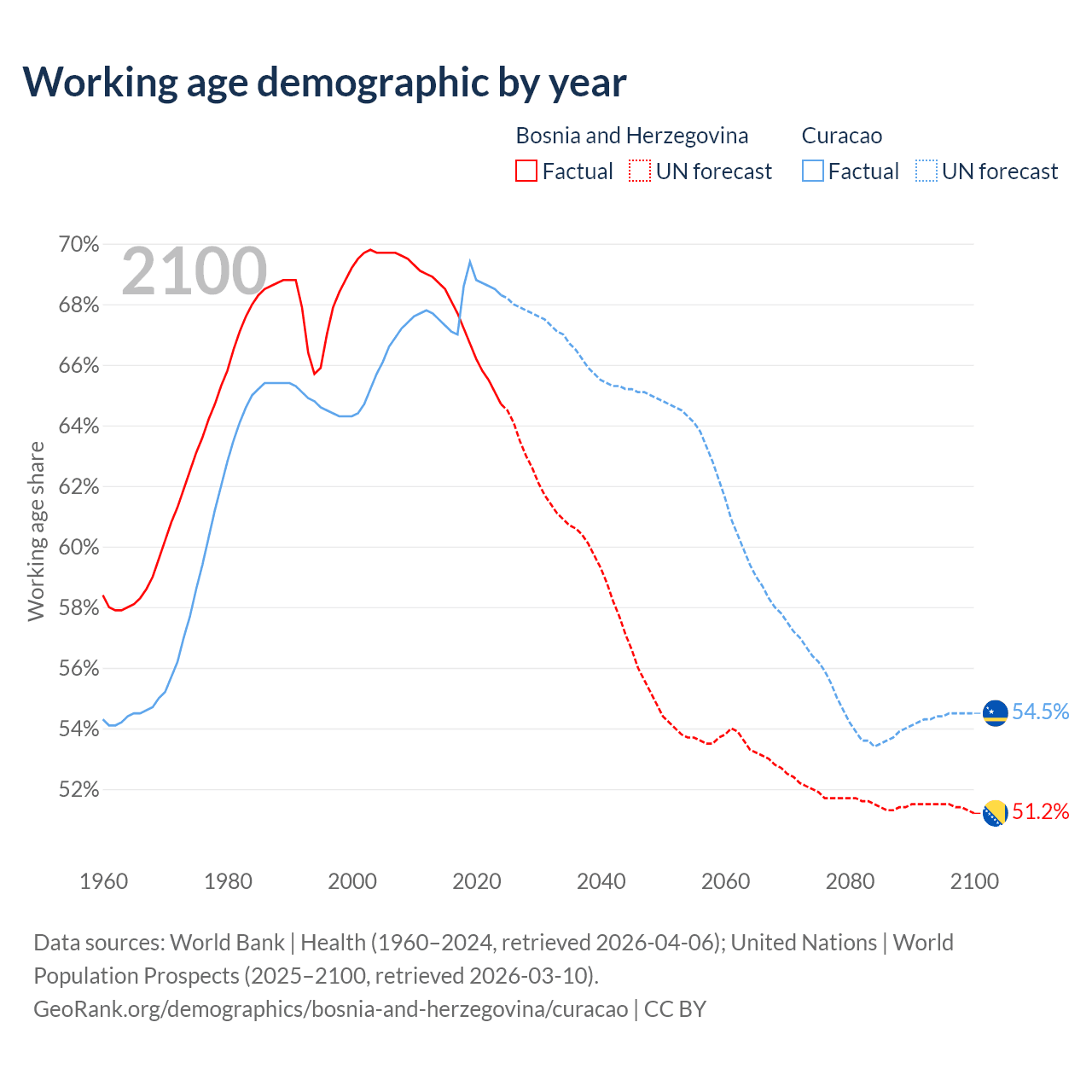 Median age Bosnia and Herzegovina vs Curacao, 1960-2100