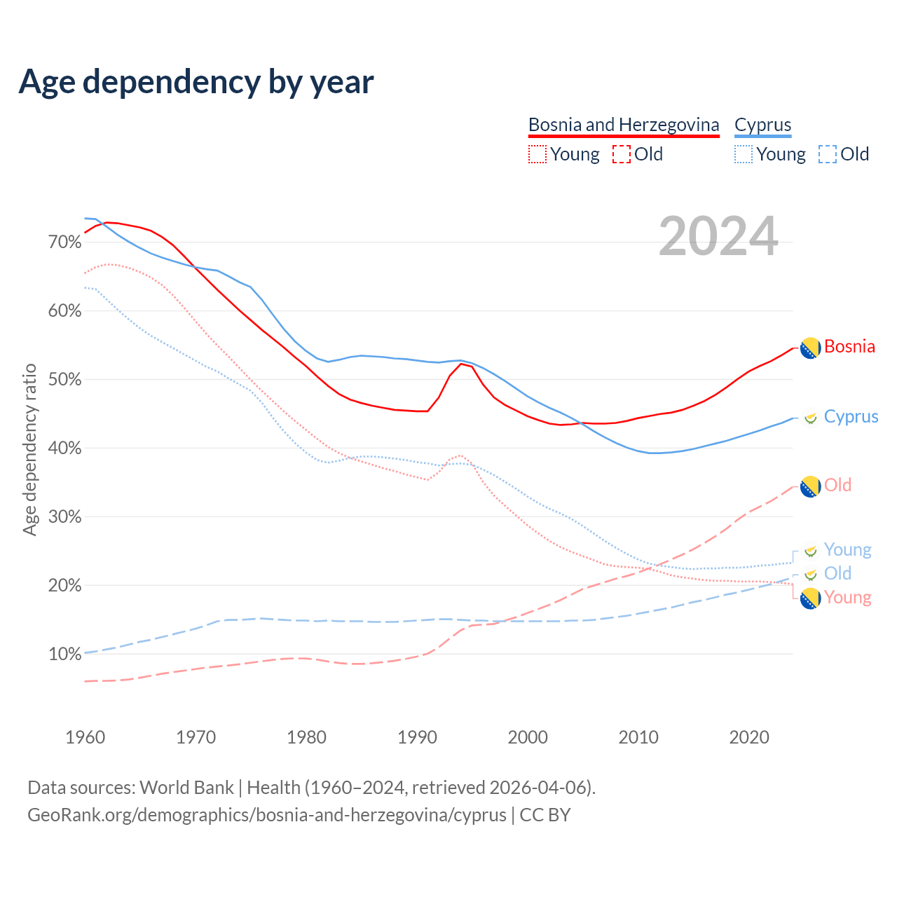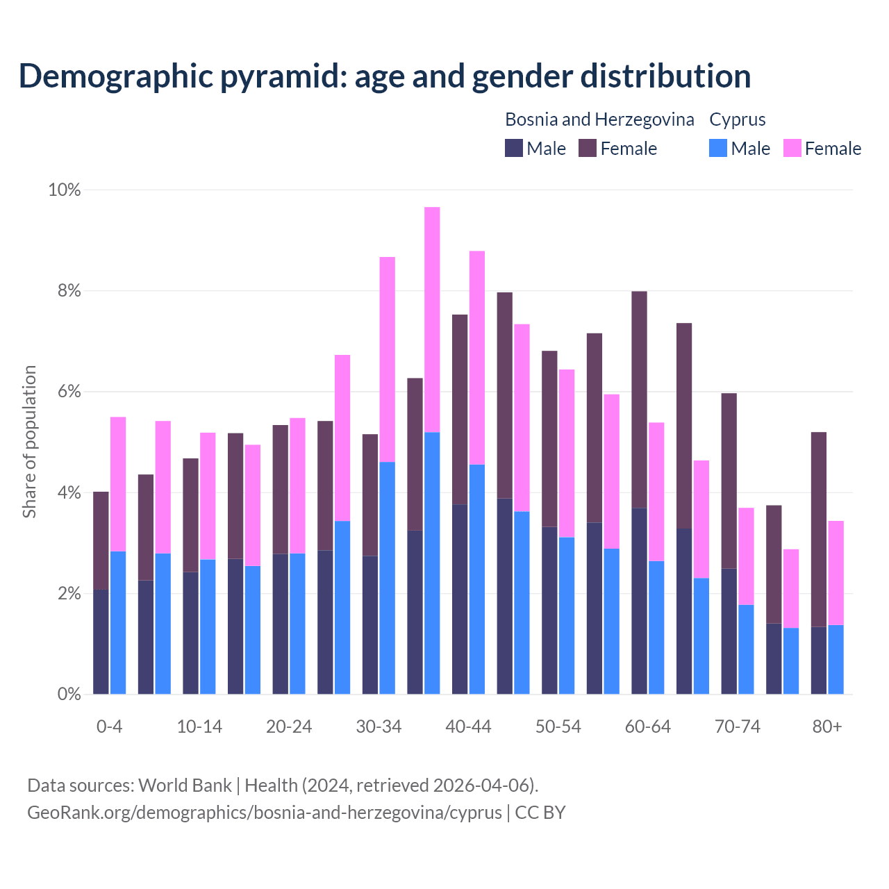 - Bosnia and Herzegovina is ranked 8/196 by median age (oldest to youngest) vs 52/196 for Cyprus.
