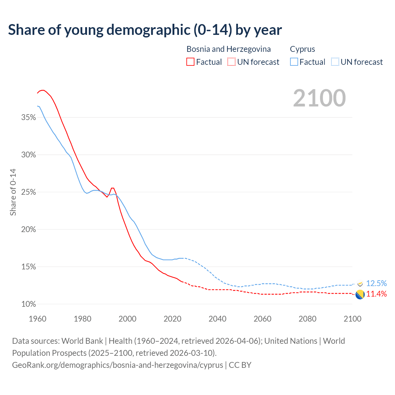 - The share of young demographic (0-15 years old) in Bosnia and Herzegovina is 13% vs 16.1% in Cyprus.