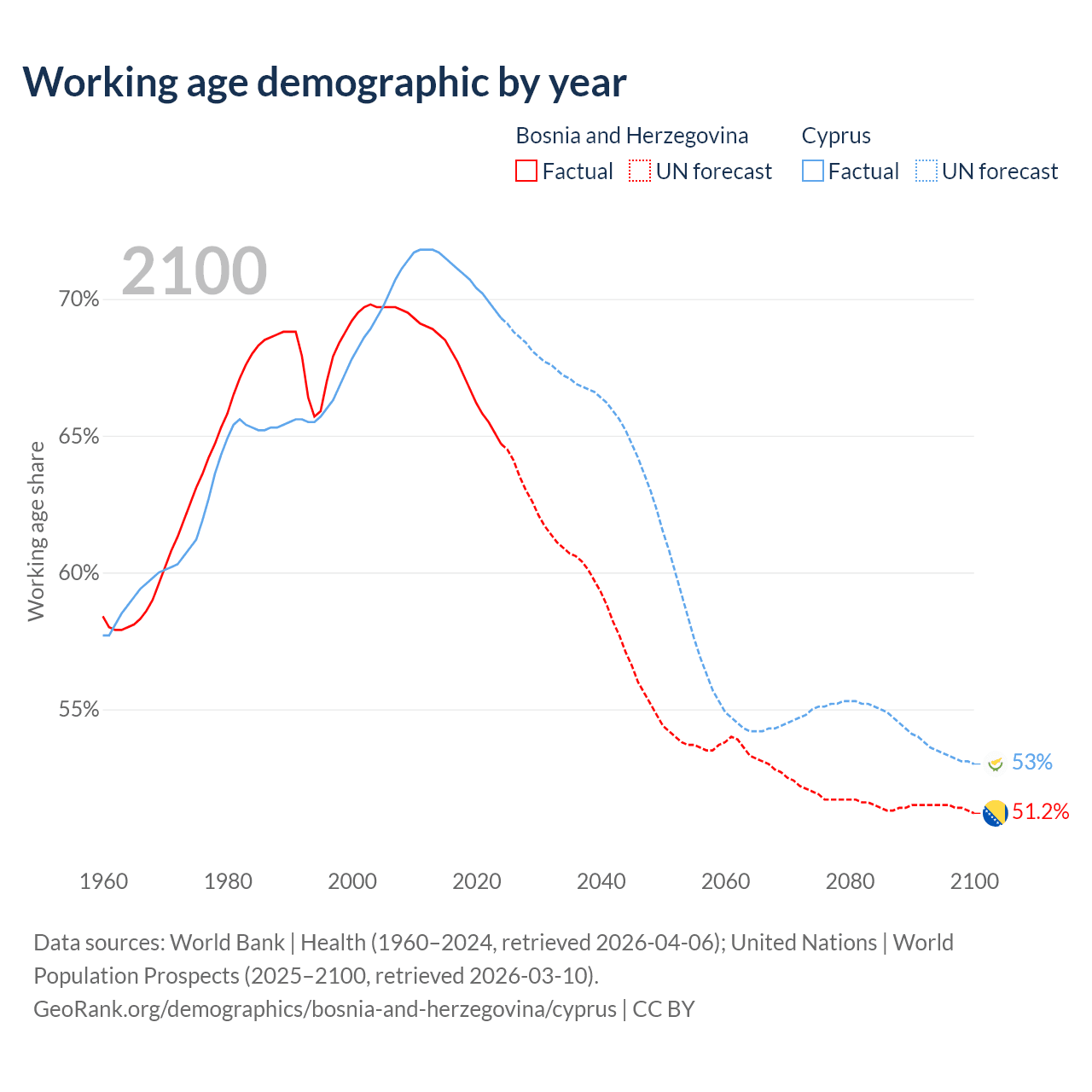 Median age Bosnia and Herzegovina vs Cyprus, 1960-2100