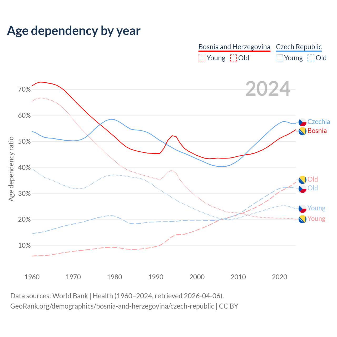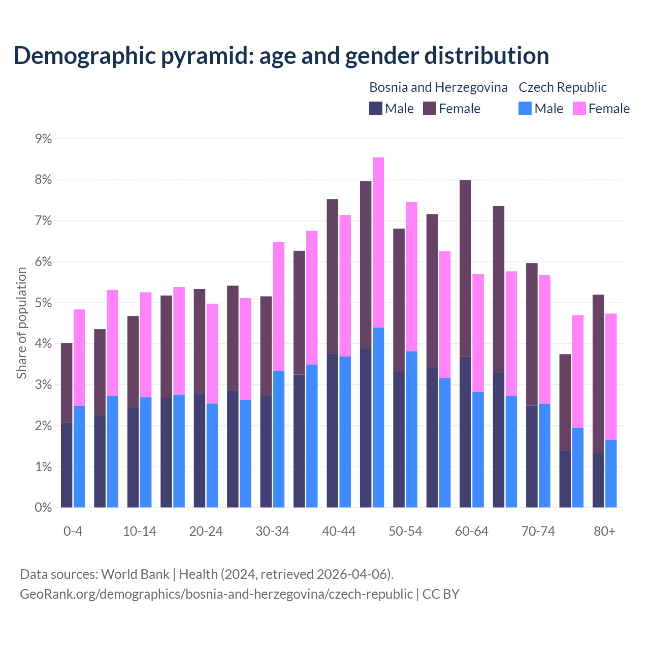 The share of older people aged 65 and over is 22.2% in Bosnia and Herzegovina and 20.8% in the Czech Republic. Life expectancy in Bosnia and Herzegovina compared to the Czech Republic .