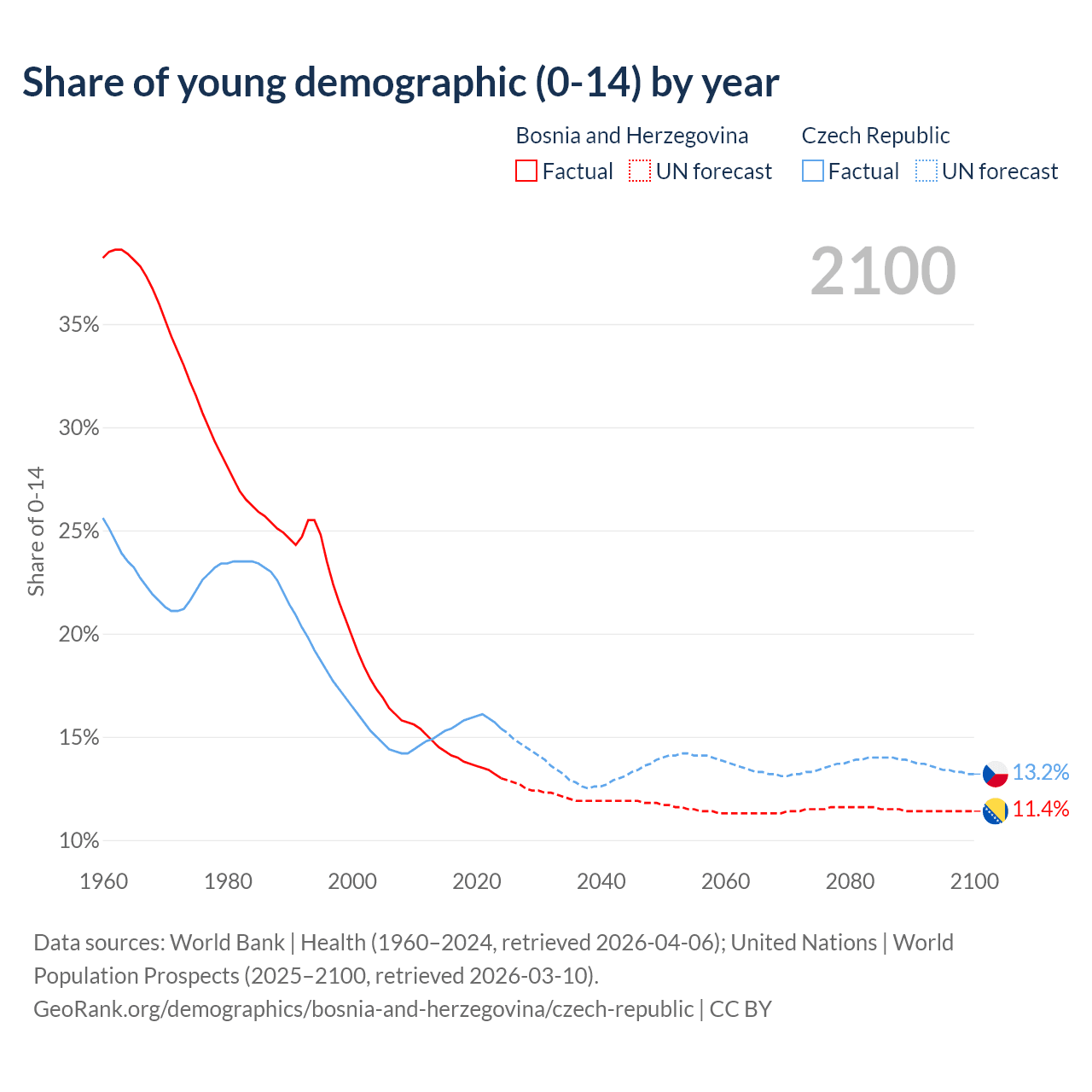 - The share of young demographic (0-15 years old) in Bosnia and Herzegovina is 13% vs 15.4% in the Czech Republic.