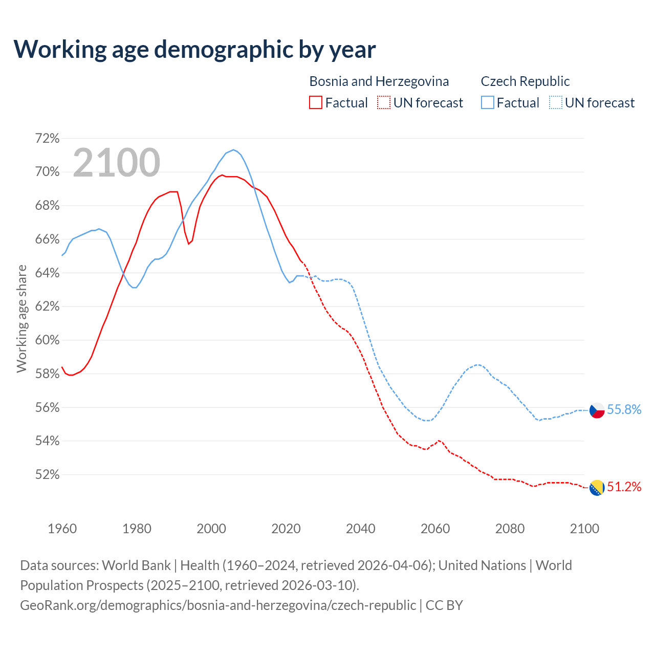 Median age Bosnia and Herzegovina vs Czech Republic, 1960-2100