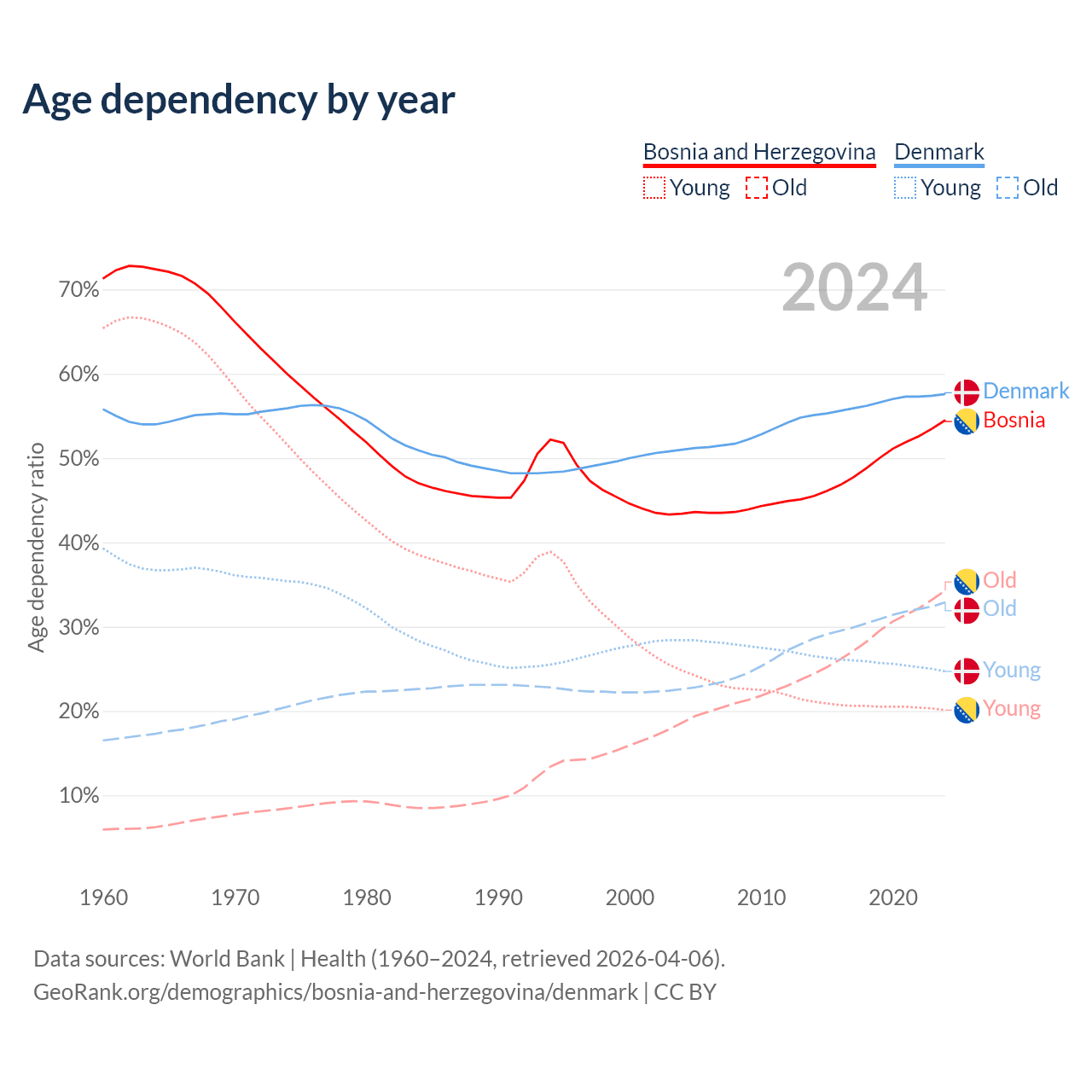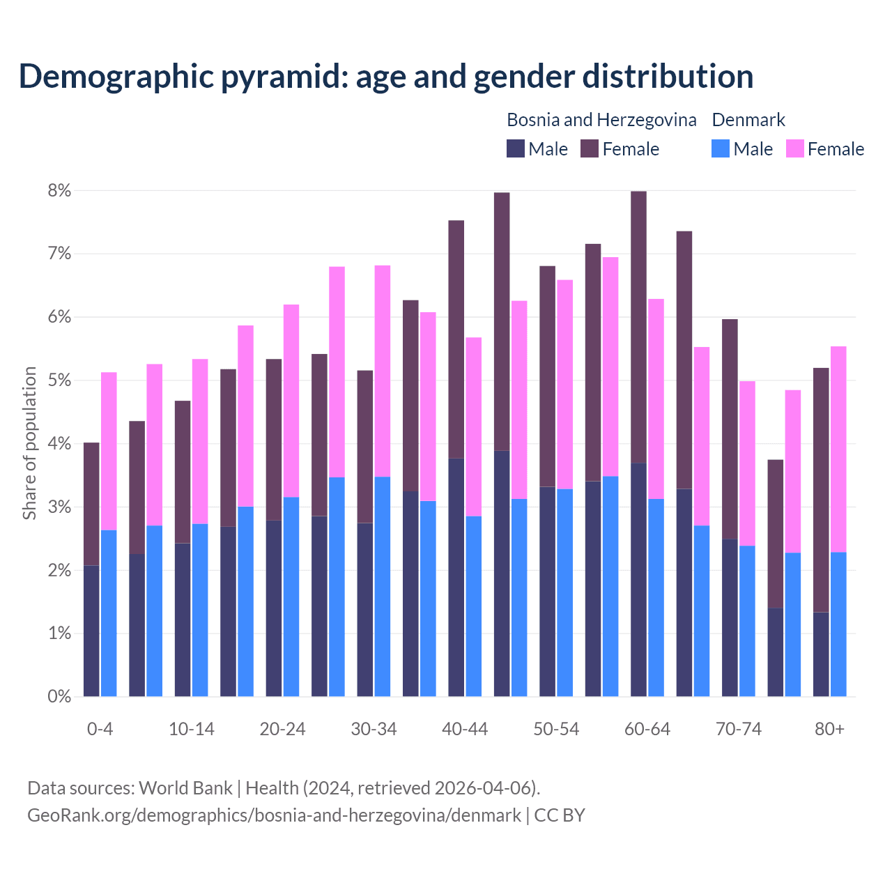 - Bosnia and Herzegovina is ranked 8/196 by median age (oldest to youngest) vs 34/196 for Denmark.