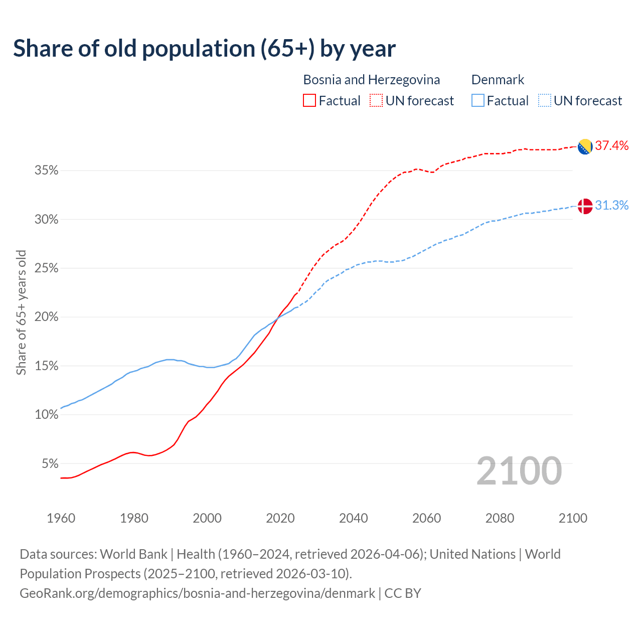 - The share of old-age demographic (65+) in Bosnia and Herzegovina is 22.2% vs 20.9% in Denmark.