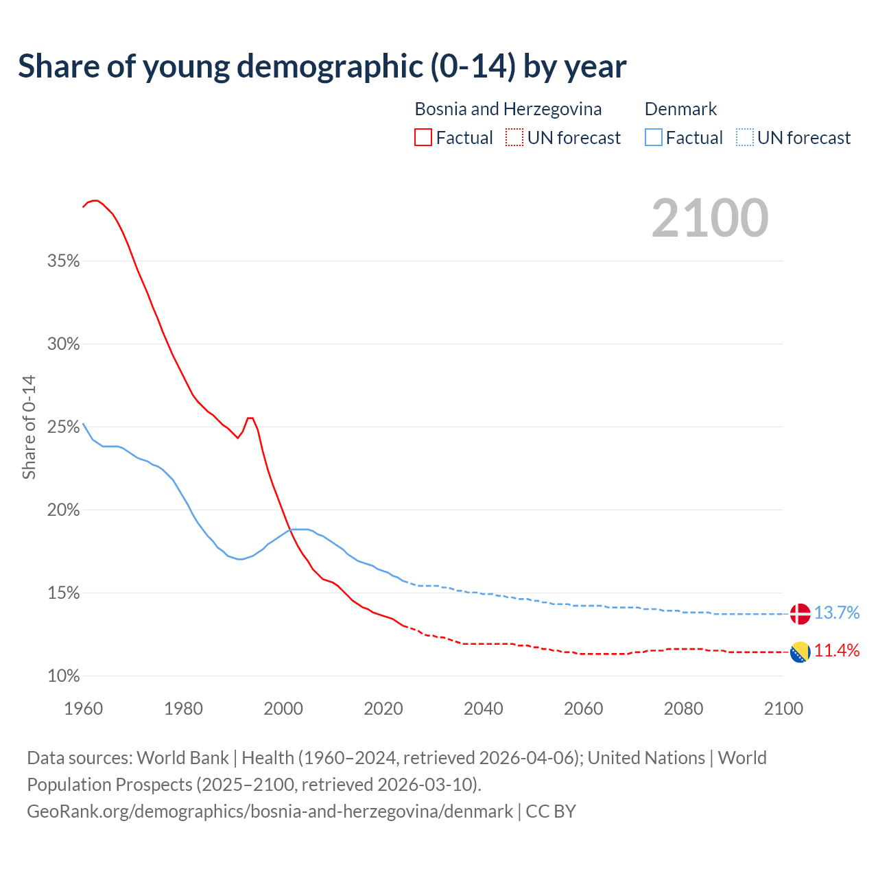 - The share of young demographic (0-15 years old) in Bosnia and Herzegovina is 13% vs 15.7% in Denmark.