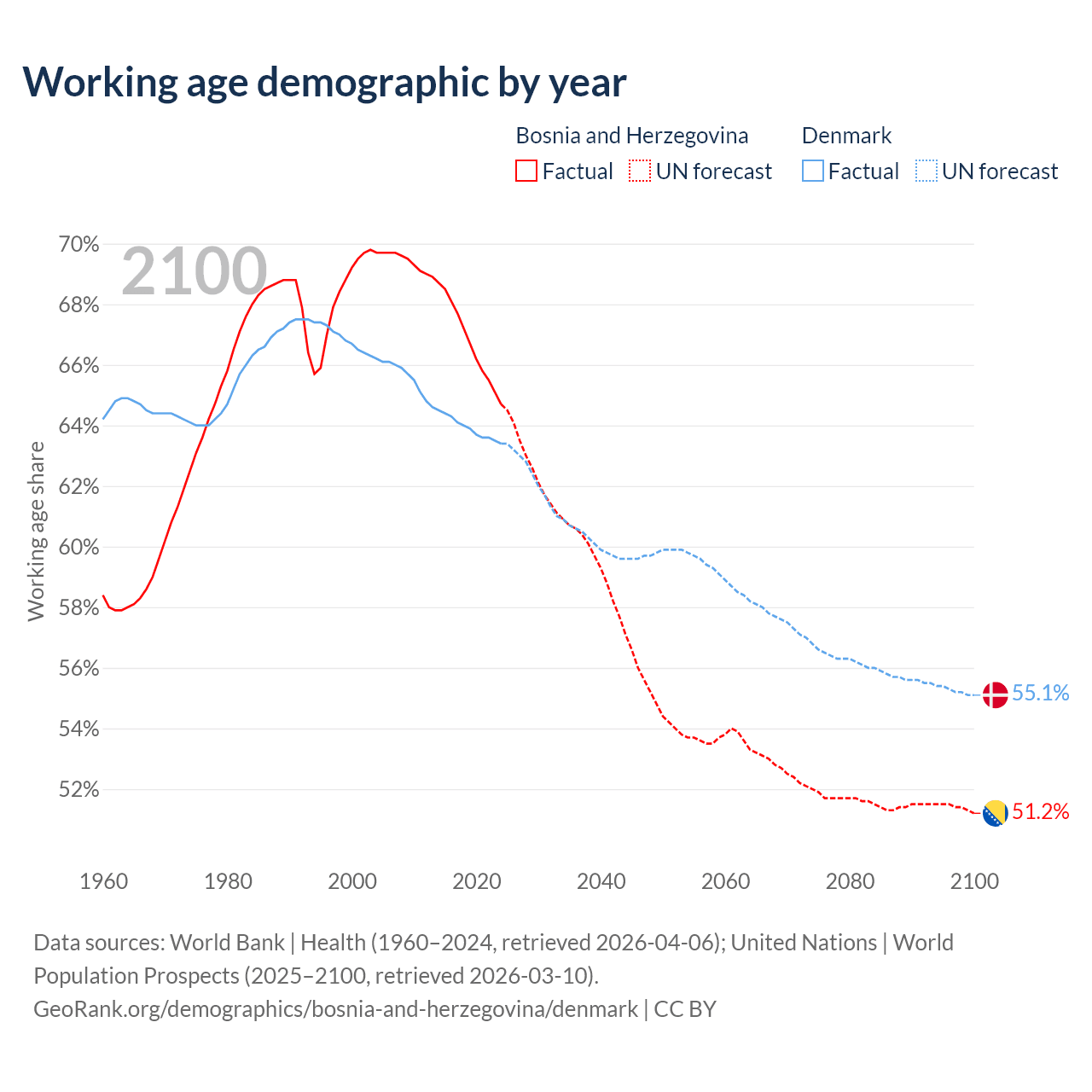 Median age Bosnia and Herzegovina vs Denmark, 1960-2100
