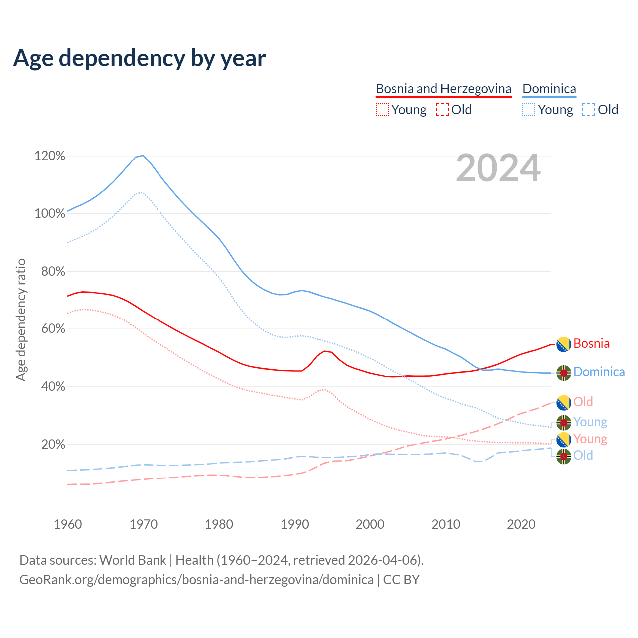- Bosnia and Herzegovina is ranked 8/196 by median age (oldest to youngest) vs 66/196 for Dominica.