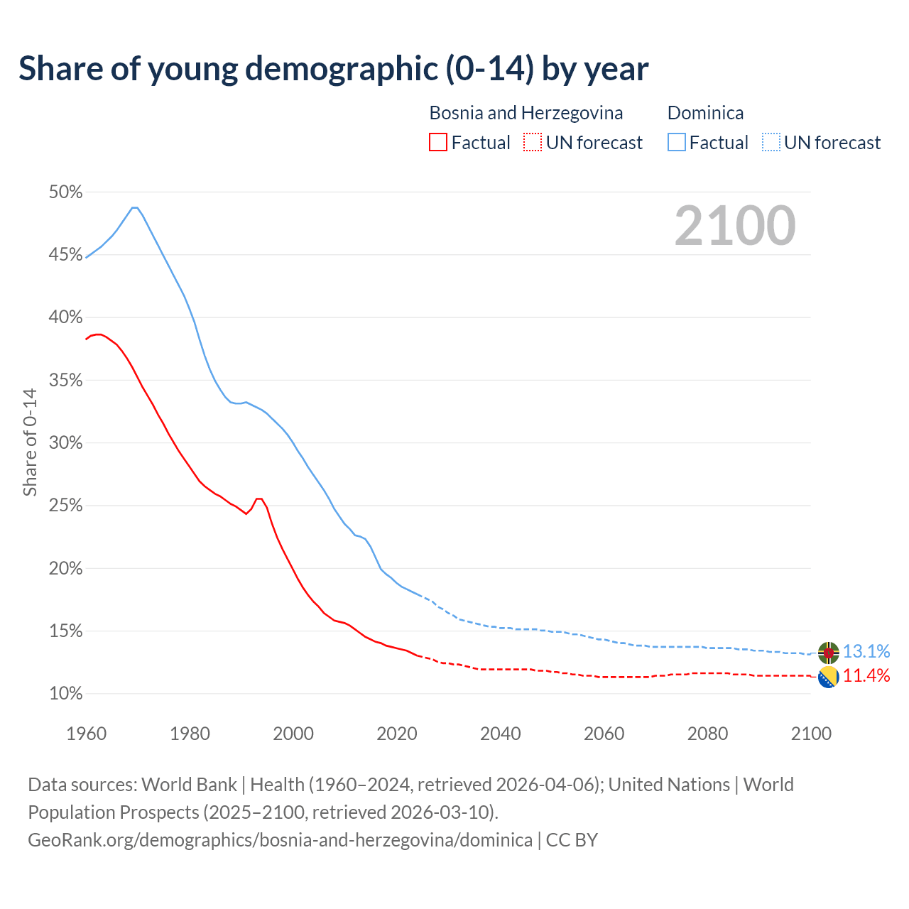 - The share of young demographic (0-15 years old) in Bosnia and Herzegovina is 13% vs 17.9% in Dominica.